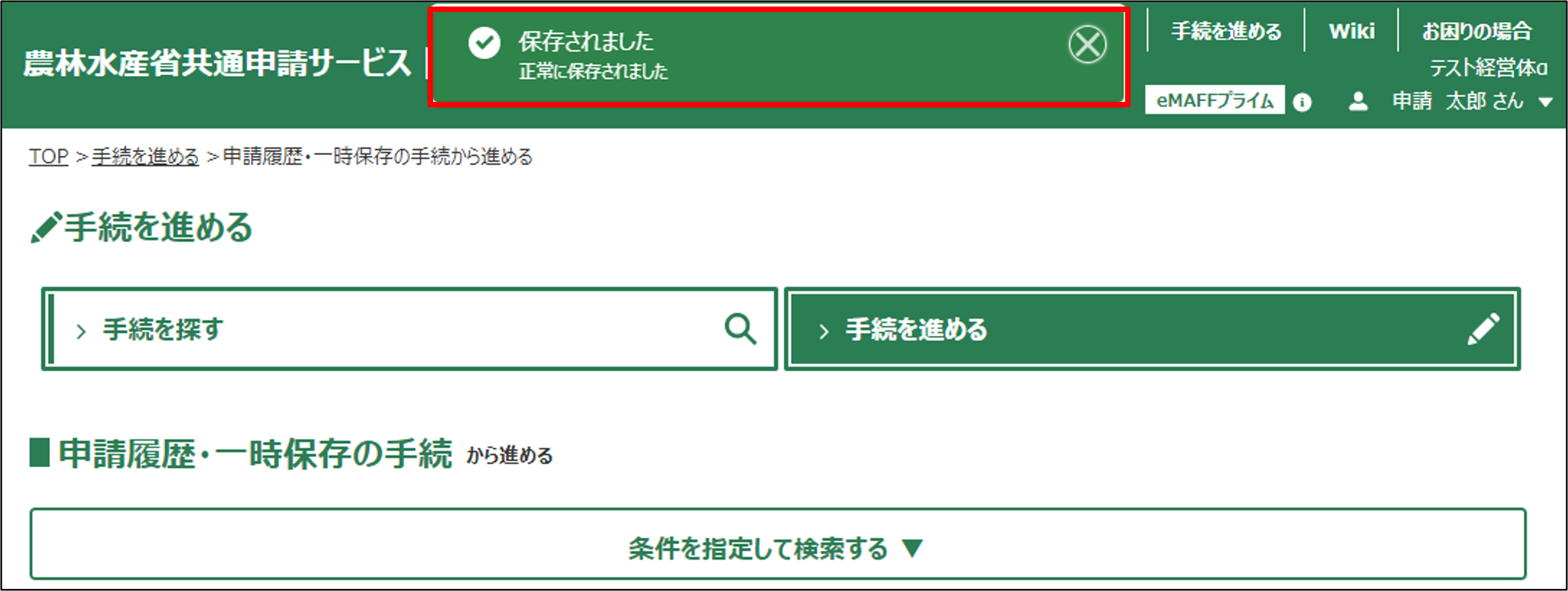 28.「申請」ボタンクリック後、正常に申請された場合は、「手続の詳細」画面が自動的に閉じて、「申請履歴・一時保存の手続から進める」画面に戻り、画面上部中央に緑色の背景で「保存されました」と表示されます。