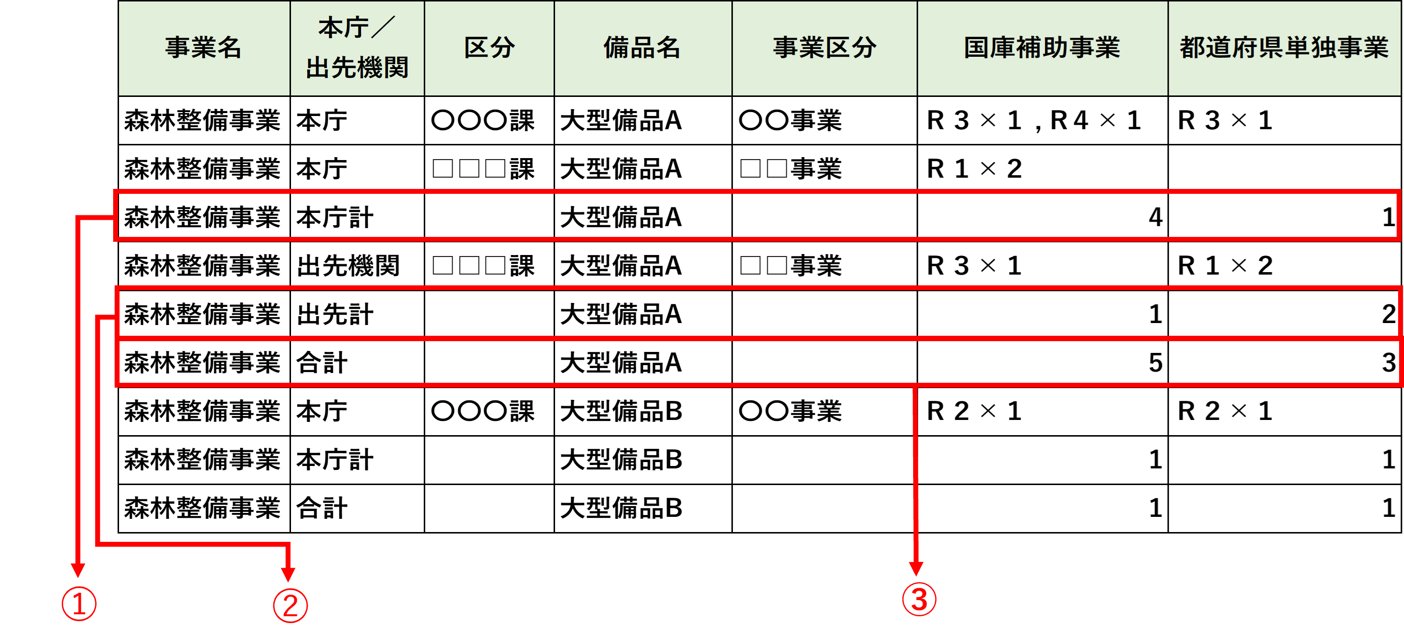 | ③ | 大型備品Aの[本庁計]と[出先計]の合計 |