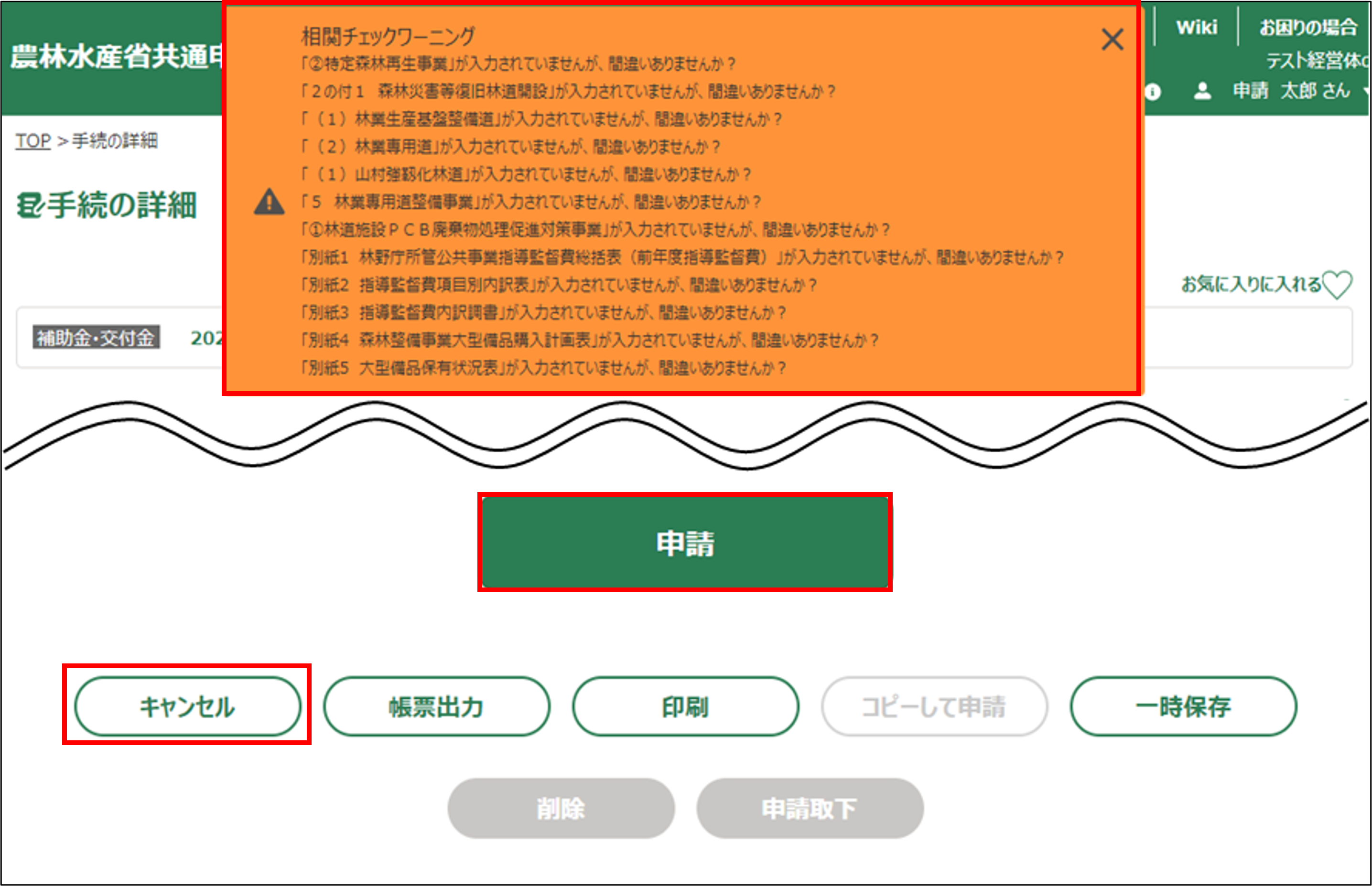 25.「申請」ボタンをクリックすると、申請内容のエラーチェックが行われます。