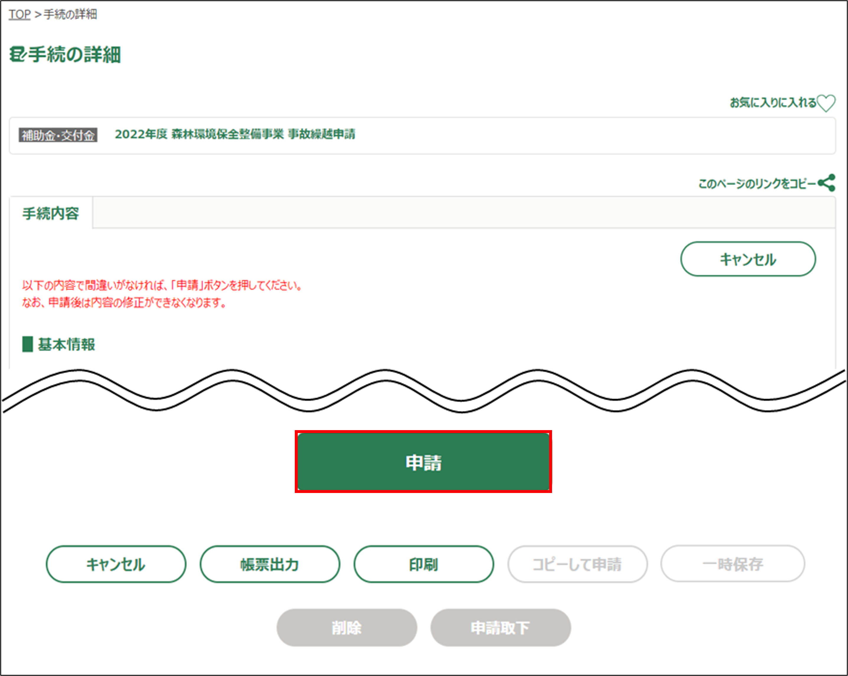 ※「別名義で申請」ボタンは、「森林環境保全整備事業」の申請では使用不可です。