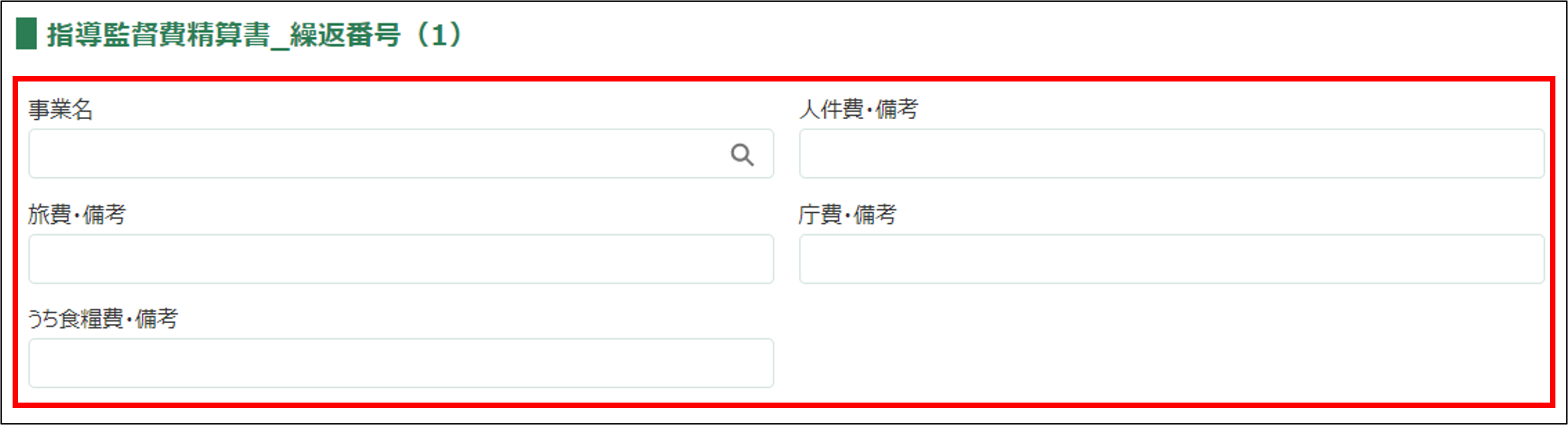 ・「指導監督費精算額(C)」と「【内訳】人件費(D)」「【内訳】旅費(E)」「【内訳】庁費(F)」の合計が一致する必要があります。 [人件費D]+[旅費E]+[庁費F]=[指導監督費精算額C] ・「前回の申請内容を反映する」ボタンで反映した明細行は削除しないでください。 |