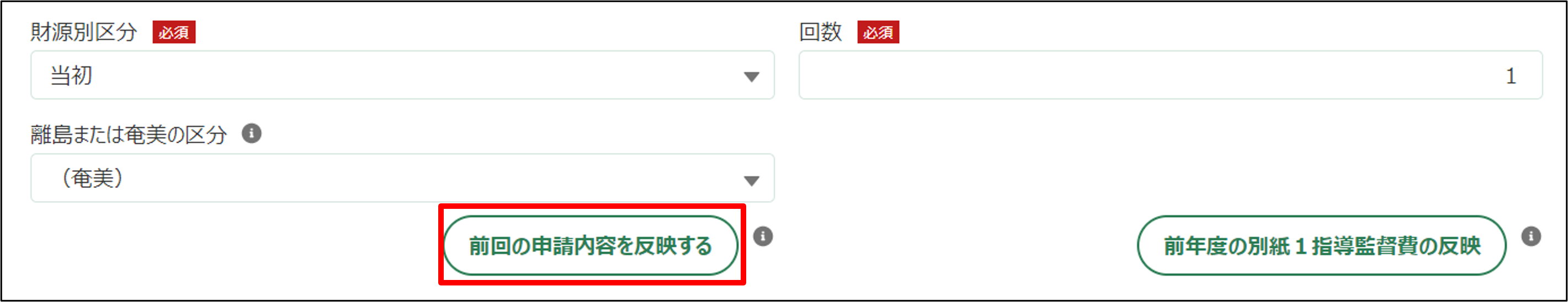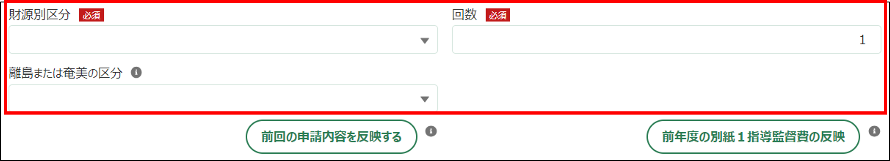 3.財源別区分、回数、離島または奄美の区分を入力します。