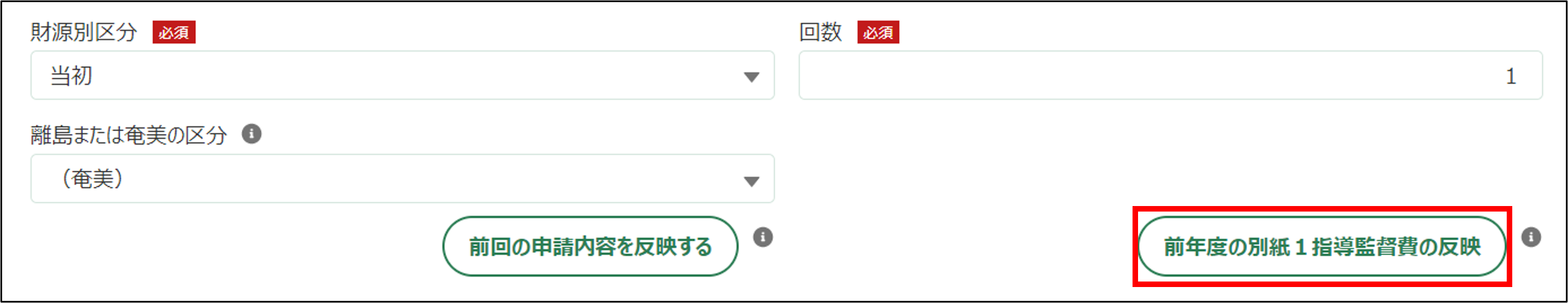 4.前年度の申請情報がある場合は「前年度の別紙1指導監督費の反映」ボタンをクリックします。