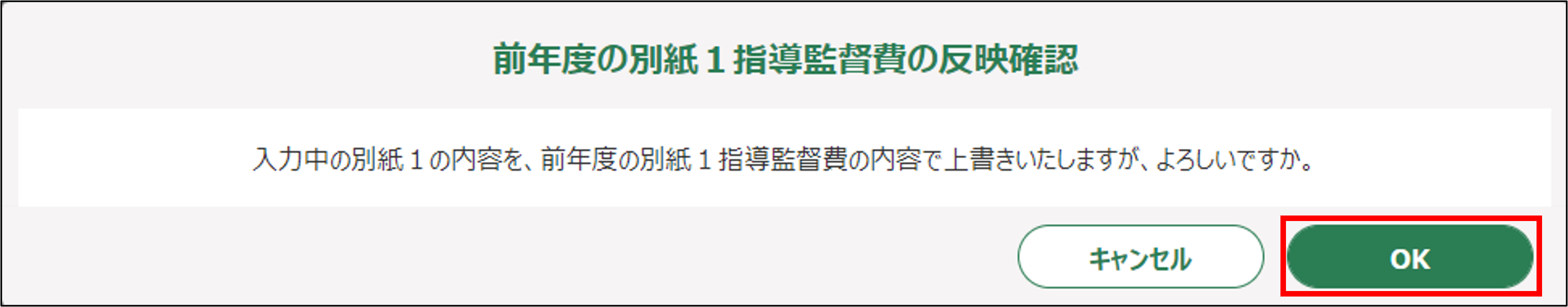 5.「前年度の別紙1指導監督非総括費の反映確認」画面が表示されますので、確認のうえ「OK」ボタンをクリックします。