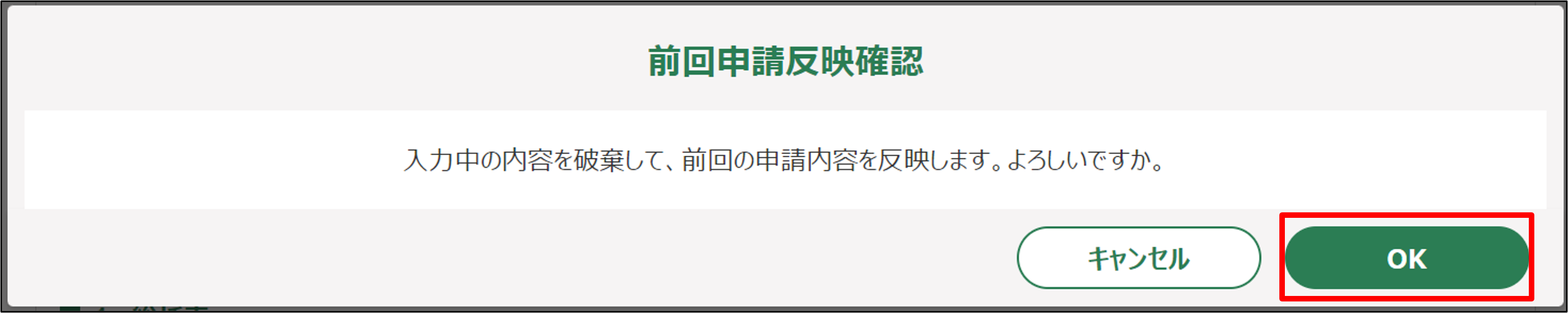8.「前回申請反映確認」画面が表示されますので、確認のうえ「OK」ボタンをクリックします。