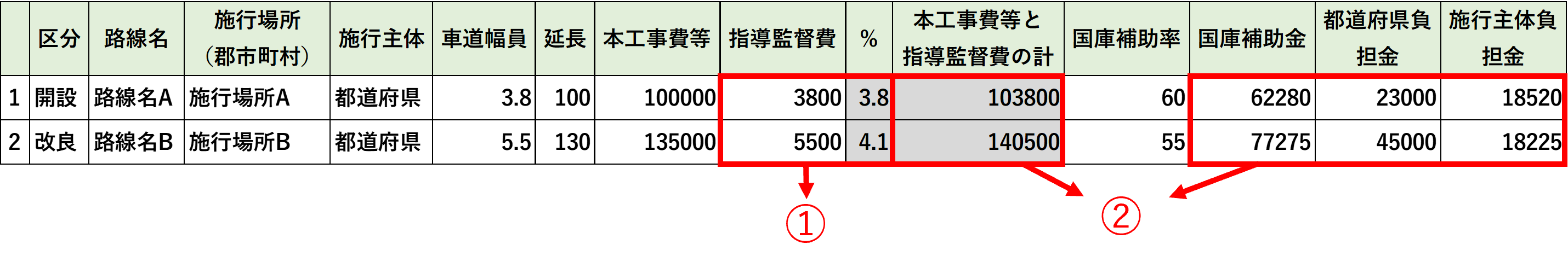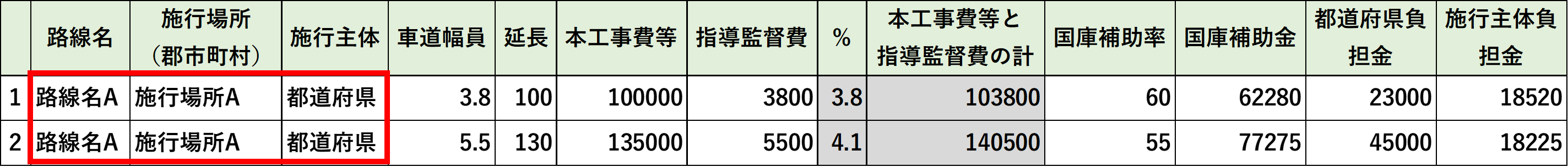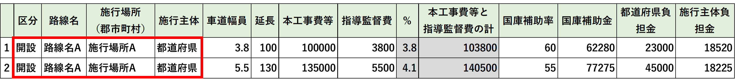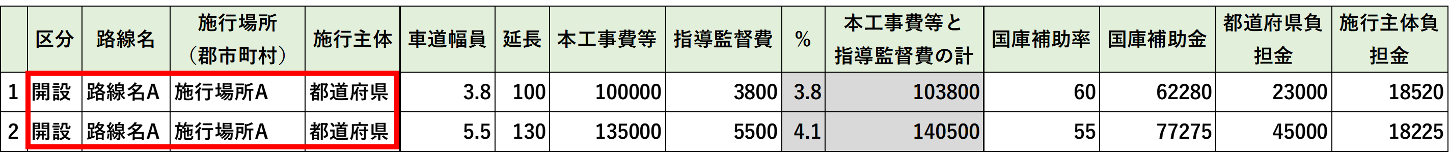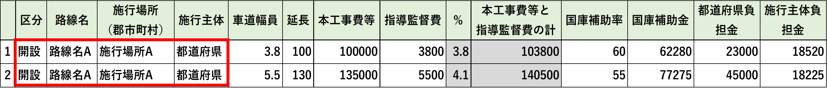 「国庫補助金」「県(都道府)負担金」「所有者(施行者)・施行主体負担金」の合計が表示されます。 |