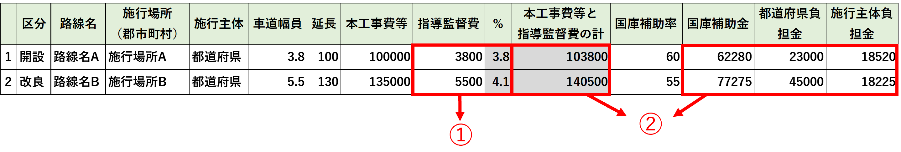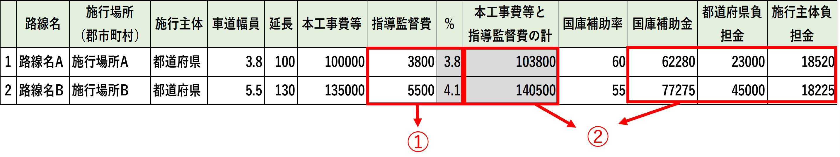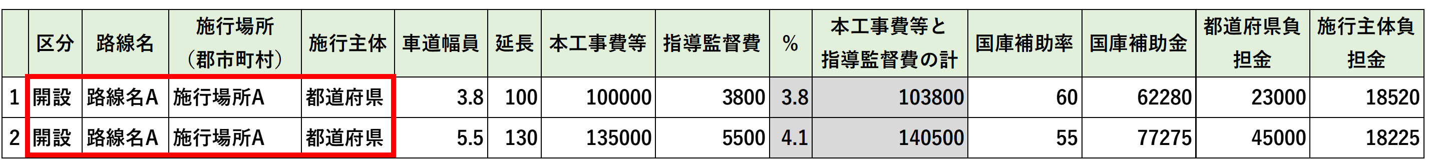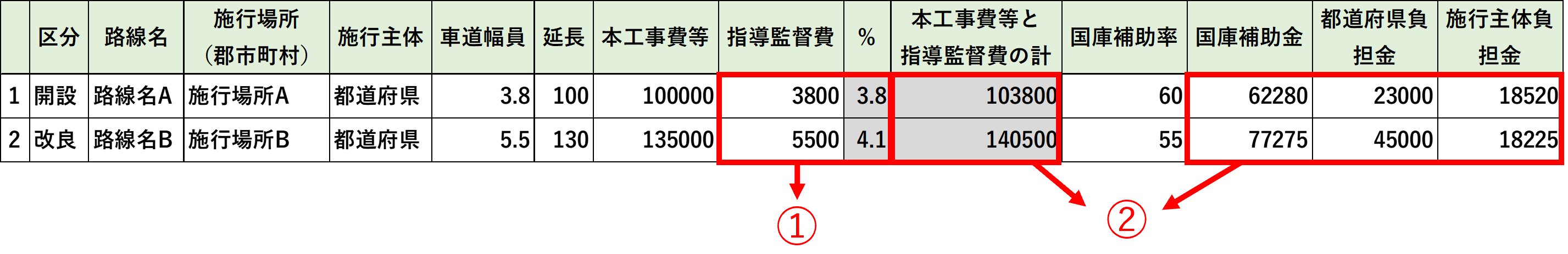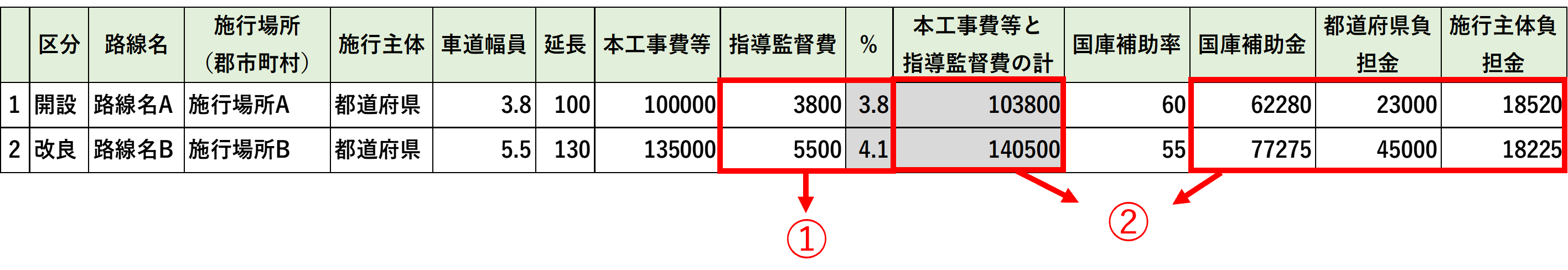 「国庫補助金」「県(都道府)負担金」「所有者(施行者)・施行主体負担金」の合計が表示されます。 |