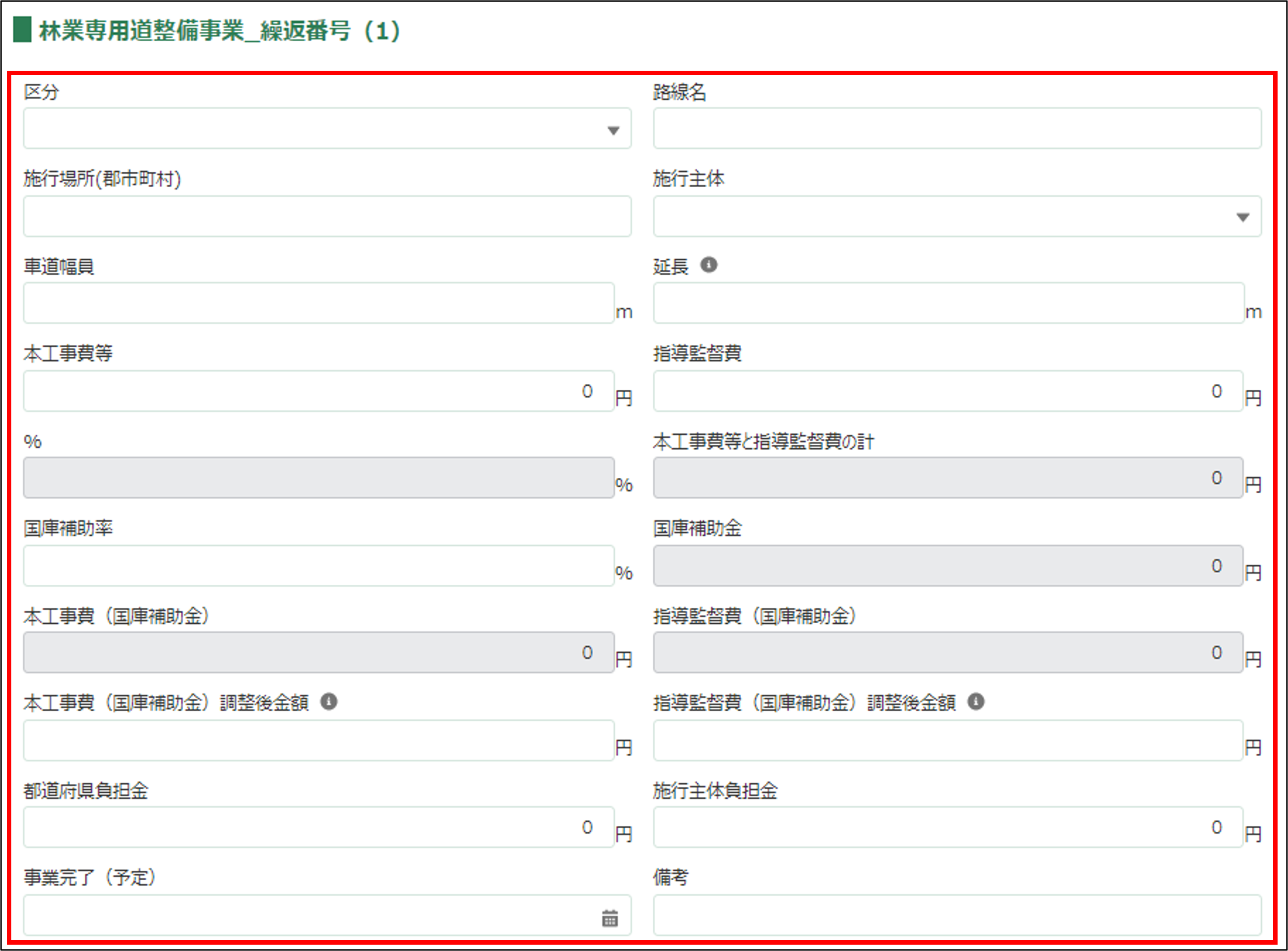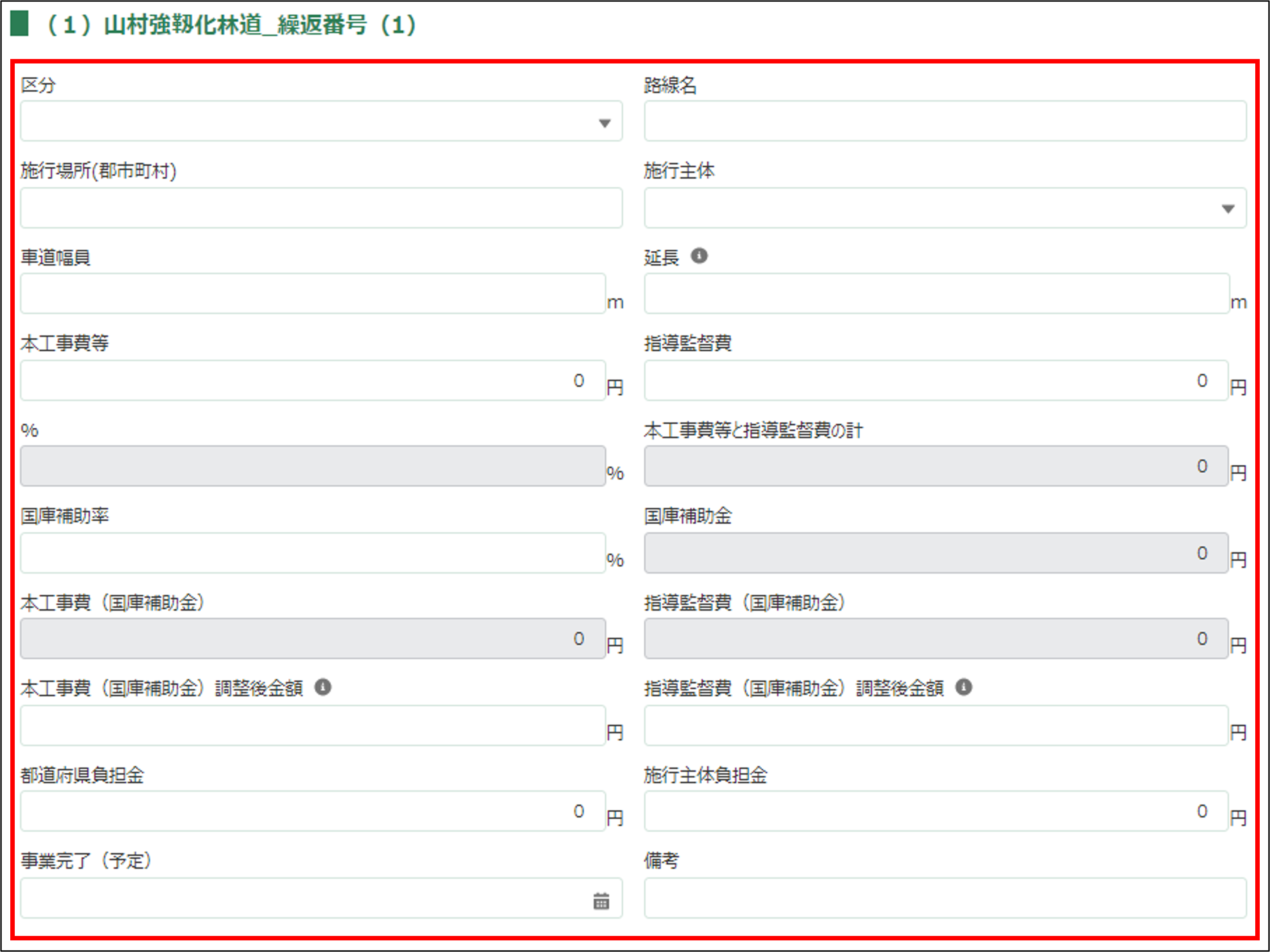 所有者(施行者)・施行主体負担金を0以上の半角数字で入力してください。 ※区分が「指導監督費」の場合は、0を入力してください。 |