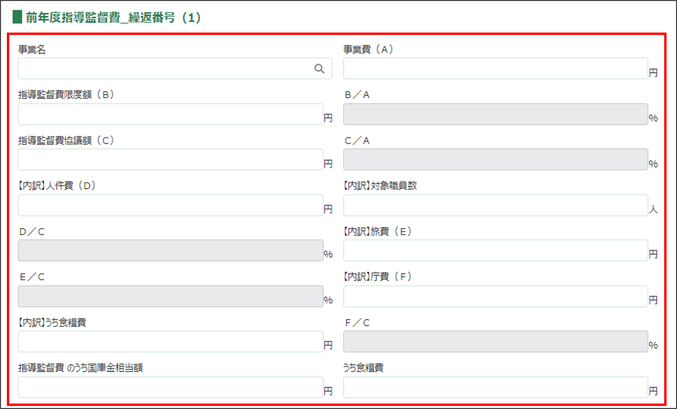 ・区分が「指導監督費」の事業費を区分が「うち県補助事業」の事業費で除算した値が0.045以下になるようにしてください。 [うち県補助事業の事業費]÷[指導監督費の事業費]<= 0.045 |