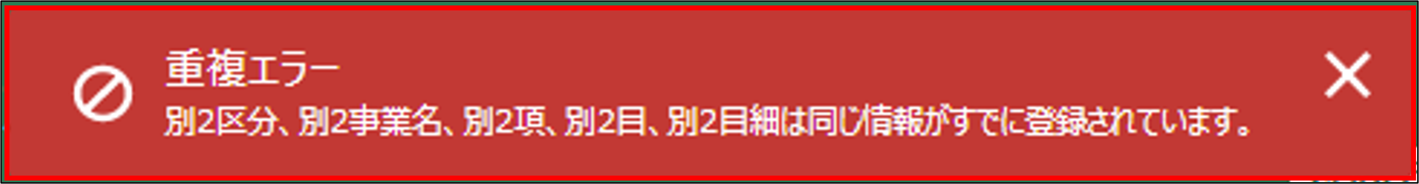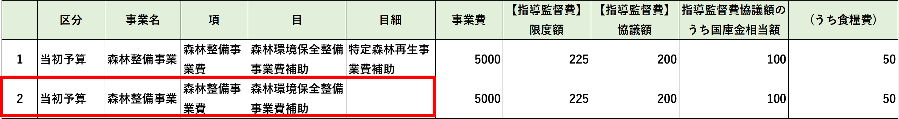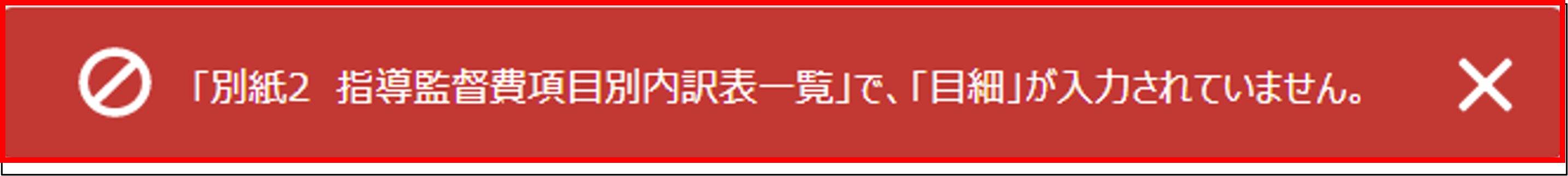 ・「区分」「事業名」「項」「目」「目細」のすべてが同じ行の登録はできません 。 ・「目」行の金額項目には「区分」「事業名」「項」「目」が同一の「目細」行の合計を入力してください。 ・「項」行の金額項目には「区分」「事業名」「項」が同一の「目」行の合計を入力してください。 ・「別紙2 指導監督費項目別内訳表」の「項」行の【指導監督費】協議額合計と、「別紙3 指導監督費内訳調書」の金額合計が一致する必要があります。 |