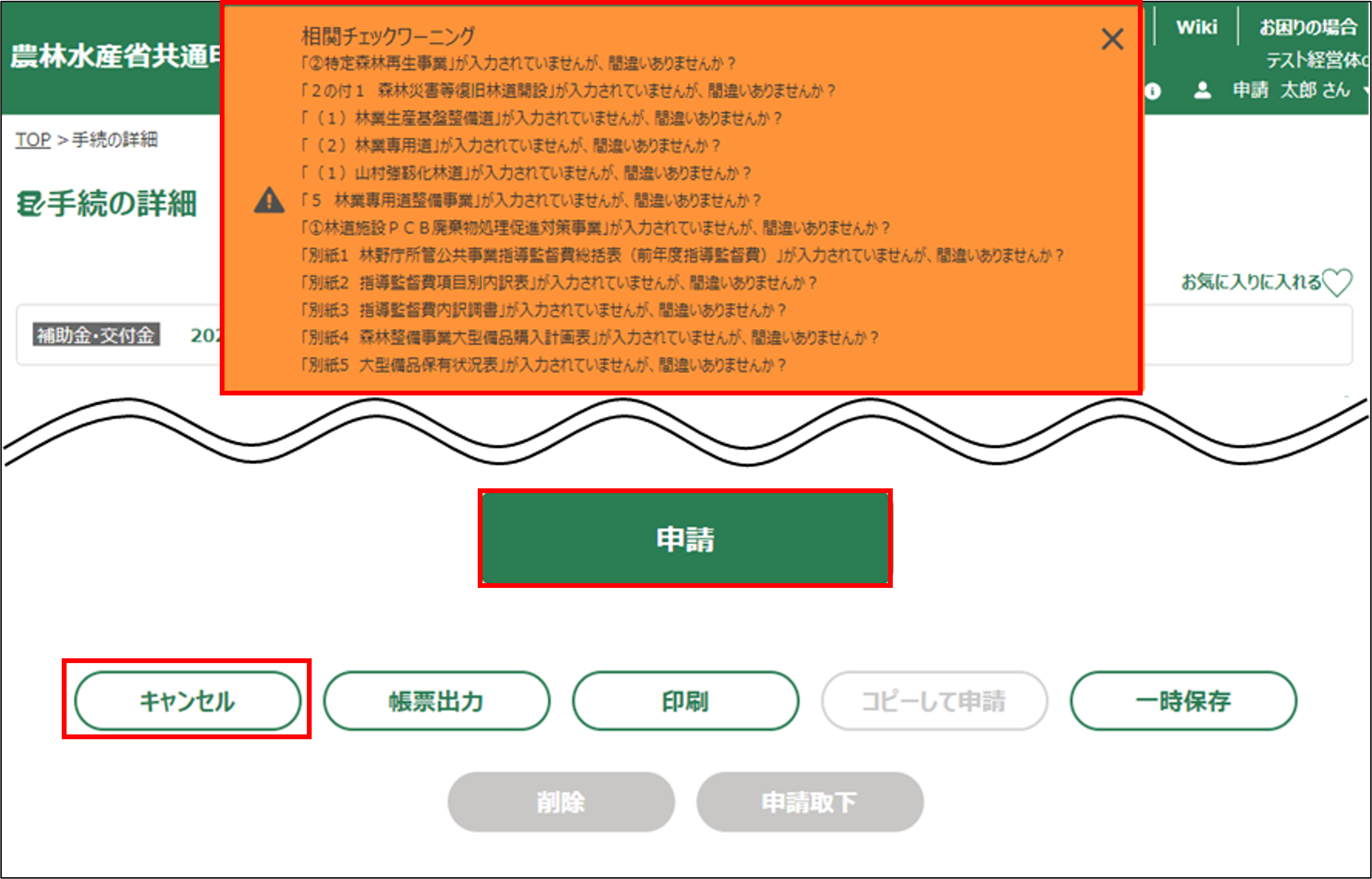 28.申請ボタンをクリックすると、申請内容のエラーチェックが行われます。