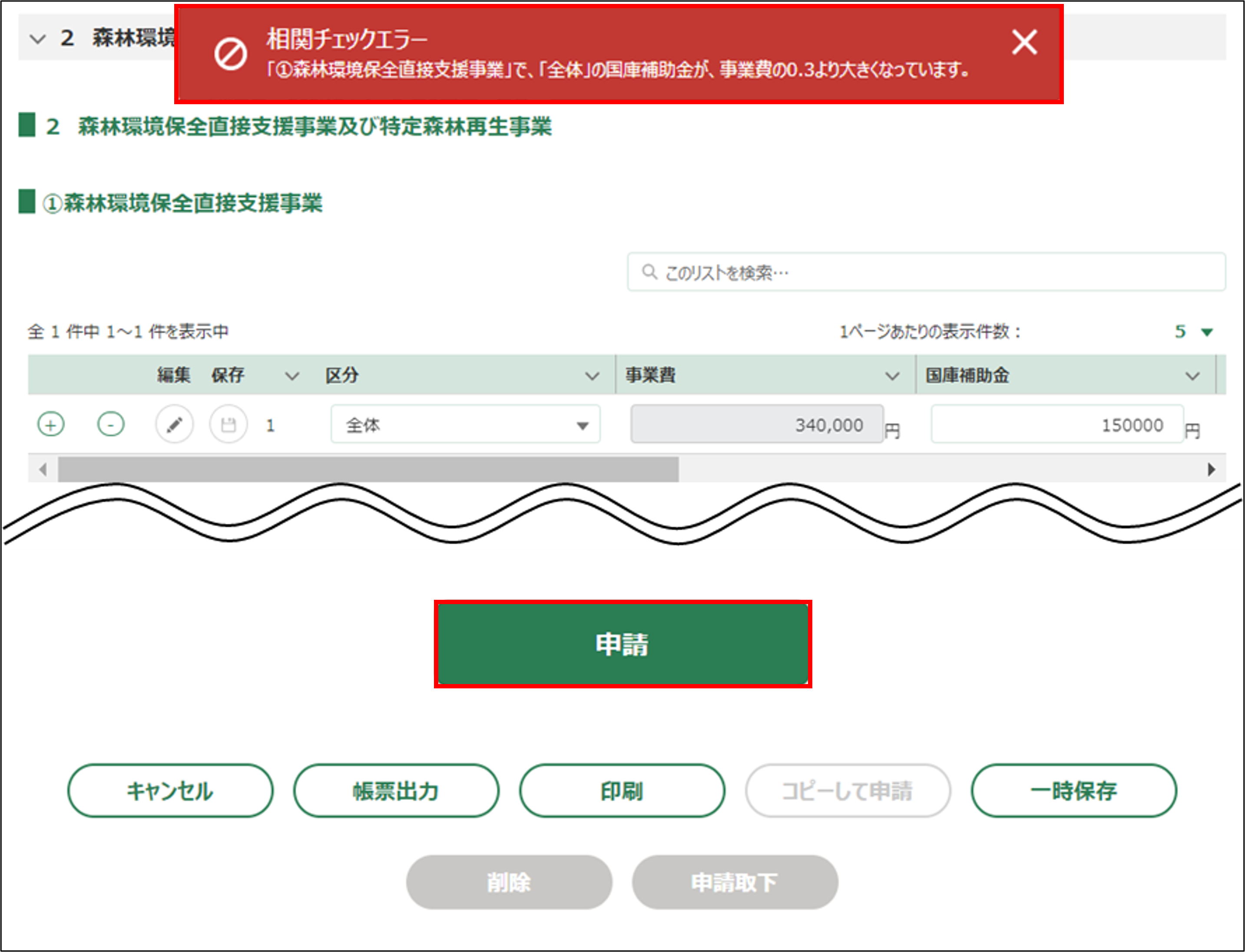 国庫補助金を0以上の半角数字で入力してください。 ※区分が「森林緊急造成」「被害森林整備」「重要インフラ施設周辺森林整備」「指導監督費」の場合は、国庫補助金を0以上でかつ国庫補助金を事業費で除算した値が0.3以下になる金額を入力してください。 (区分が「保全松林緊急保護整備」の場合は0.5以下) [国庫補助金]÷[事業費] <= 0.3 |
