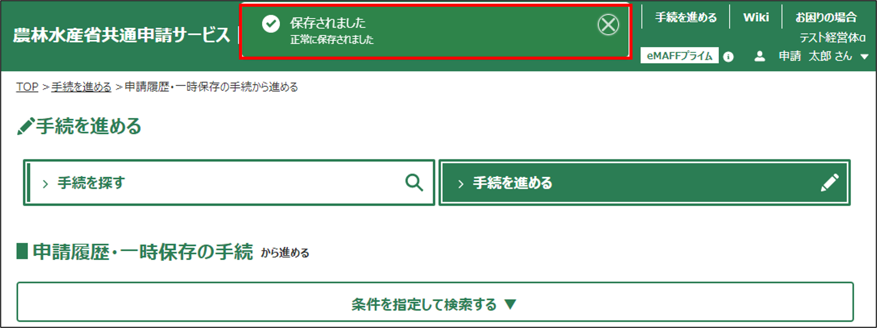 31.「申請」ボタンクリック後、正常に申請された場合は、「手続の詳細」画面が自動的に閉じて、「申請履歴・一時保存の手続から進める」画面に戻り、画面上部中央に緑色の背景で「保存されました」と表示されます。