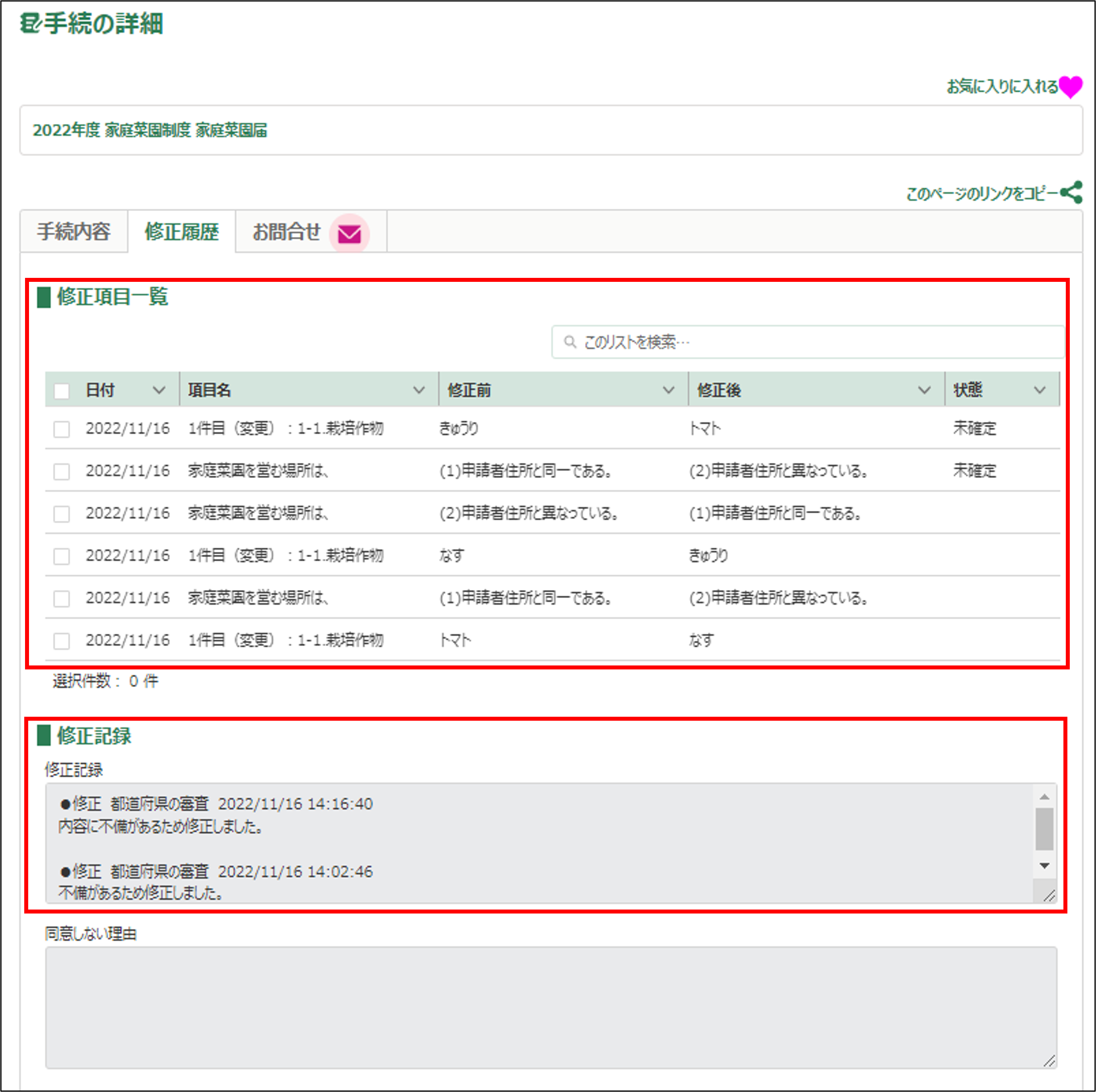 4.申請内容の「修正履歴」と、審査者が行った「修正記録」が表示されます。修正内容を確認します。