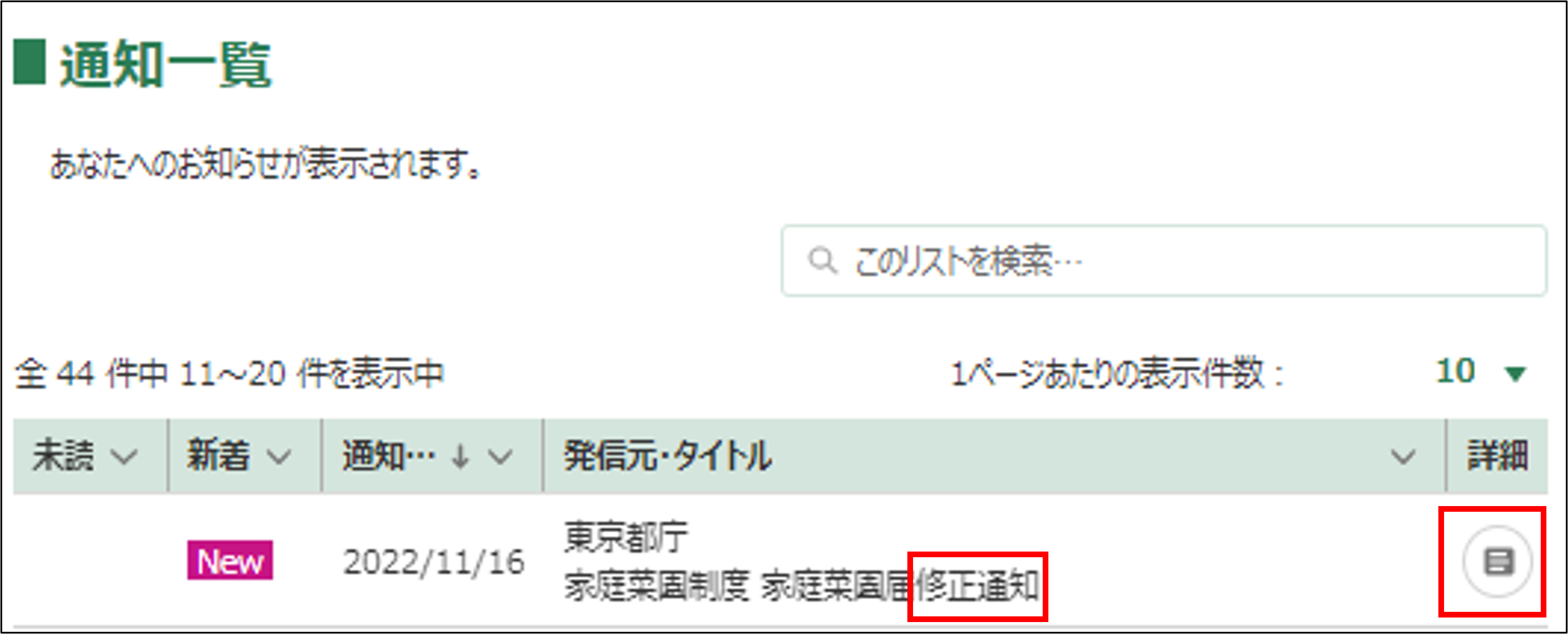 通知一覧から「修正通知」の「」ボタンをクリックします。