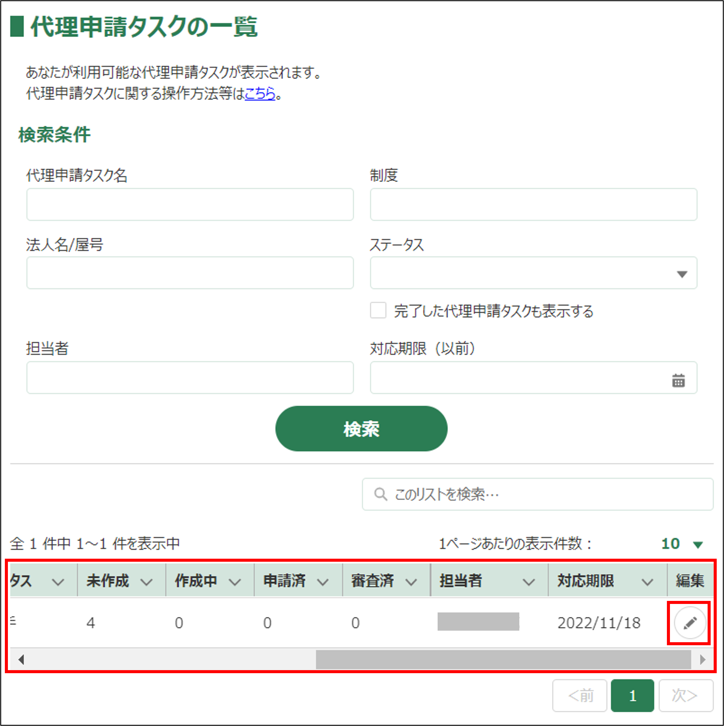 3.一覧には自身が担当する代理申請タスクが表示されます。
