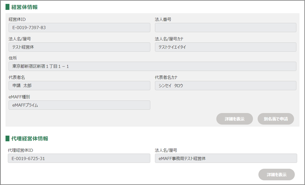 「経営体情報」には依頼元の経営体名義が表示され、「代理経営体情報」には申請代行者の経営体が表示されます。