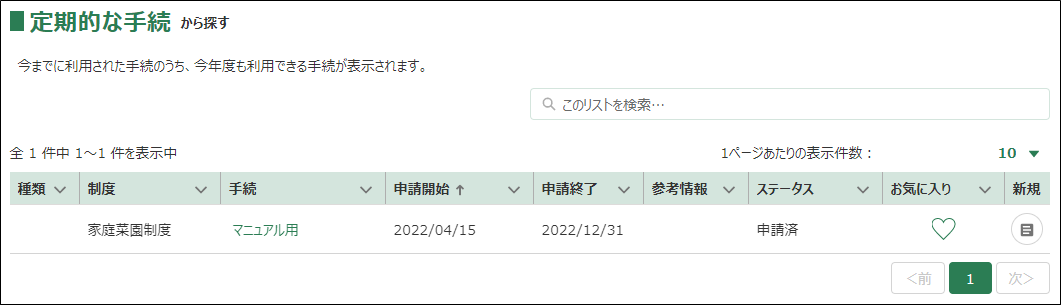 2.「定期的な手続から探す」画面が表示されます。過去に申請した手続のうち、公開期間中のものが表示されます。