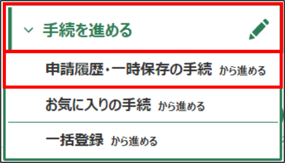 1. 画面上部のメニューから「手続を進める」をクリックし、表示された一覧から「申請履歴・一時保存の手続から進める」をクリックします。