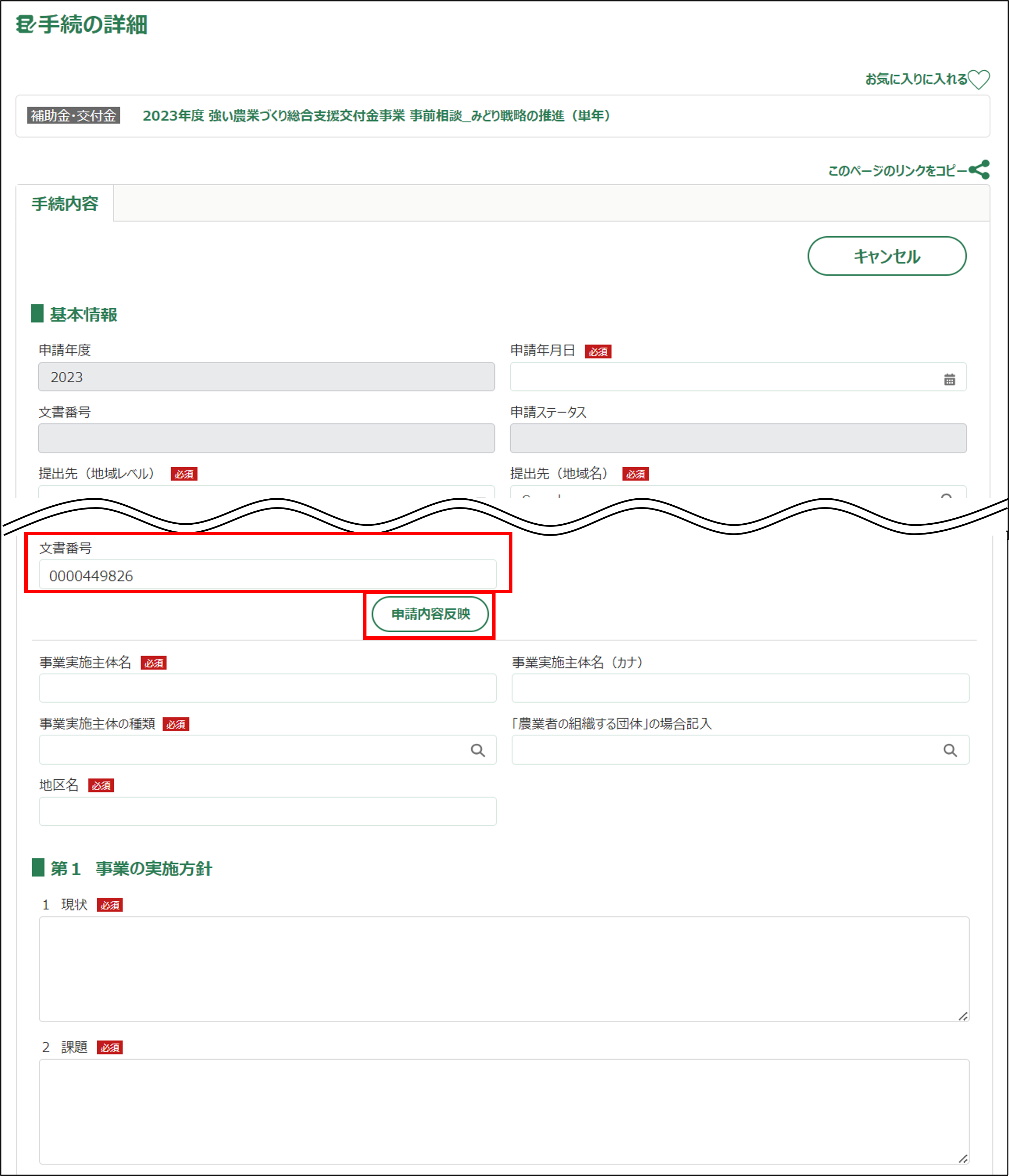 手順2で控えた、コピー対象の申請の文書番号を「文書番号」に入力し、「申請内容反映」ボタンをクリックします。