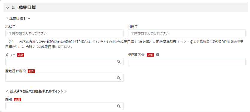 上記「メニュー」「産地基幹施設」「類別」を選択することにより、「類別の成果目標の内容」及び「現況値加算の具体的な内容」が自動設定されます。