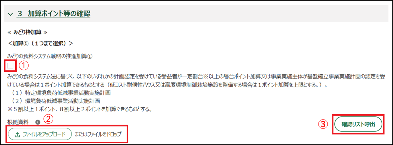 | ➀ | チェックボックス | 各成果目標(みどり枠加算(加算①)、みどり枠加算(加算②)等)ごとに、チェックを一つ入れます。 |