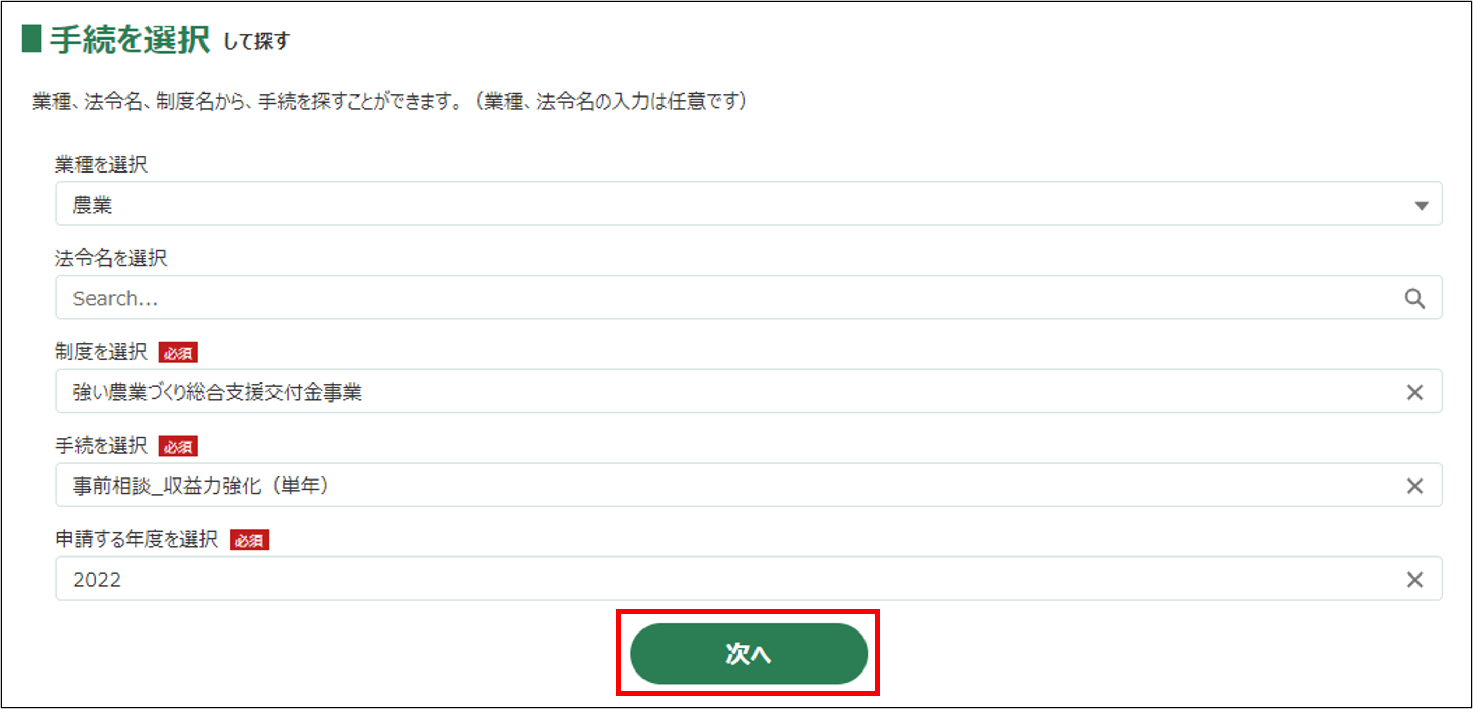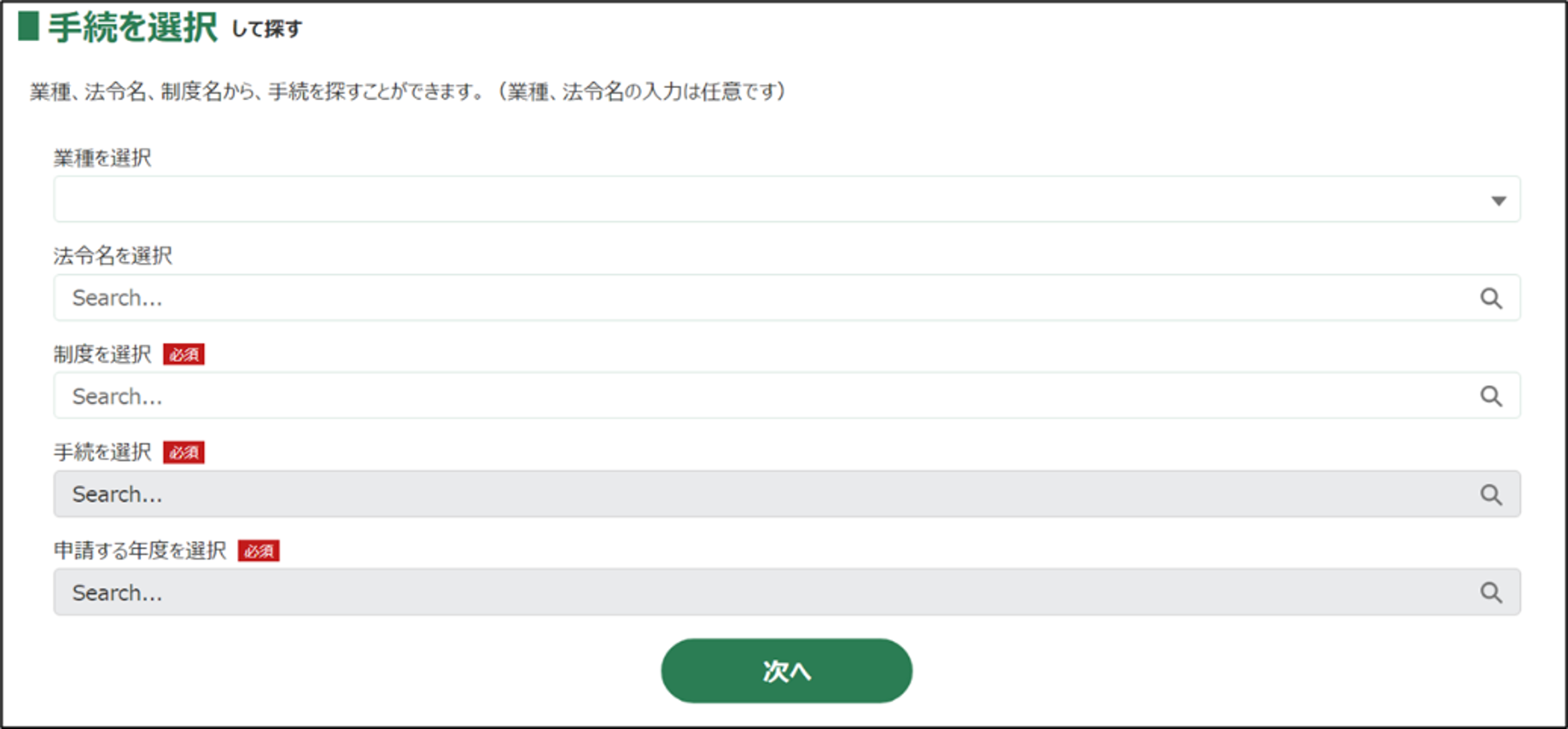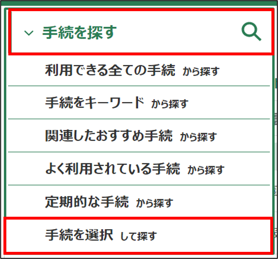 1. 画面上部のメニューから「手続を探す」をクリックし、表示された一覧から「手続を選択して探す」をクリックします。