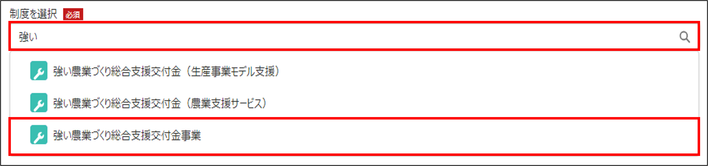 3.「制度を選択」の入力欄をクリックし、表示された一覧から「強い農業づくり総合支援交付金事業」をクリックします。