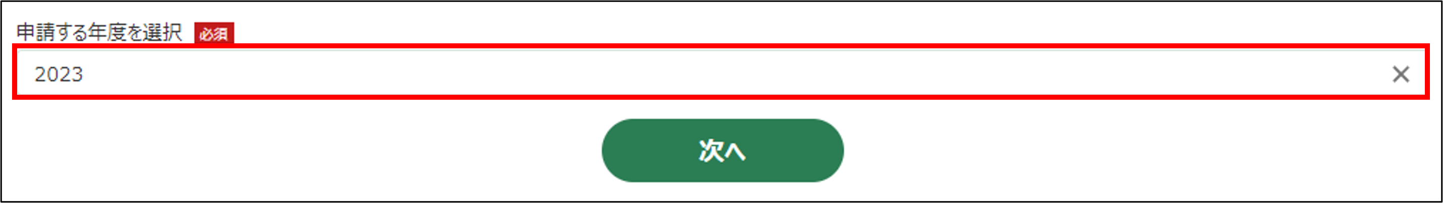 5. 「申請する年度を選択」の入力欄をクリックし、申請する年度を選択します。申請年度の選択候補が1つの場合は自動選択されます。