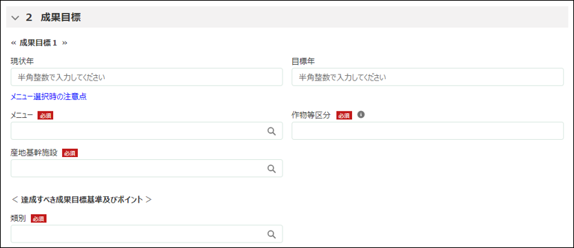 事業実施計画に対する成果目標(メニュー、産地基幹施設、類別)を最大で二つ(成果目標1、2)選択してください。