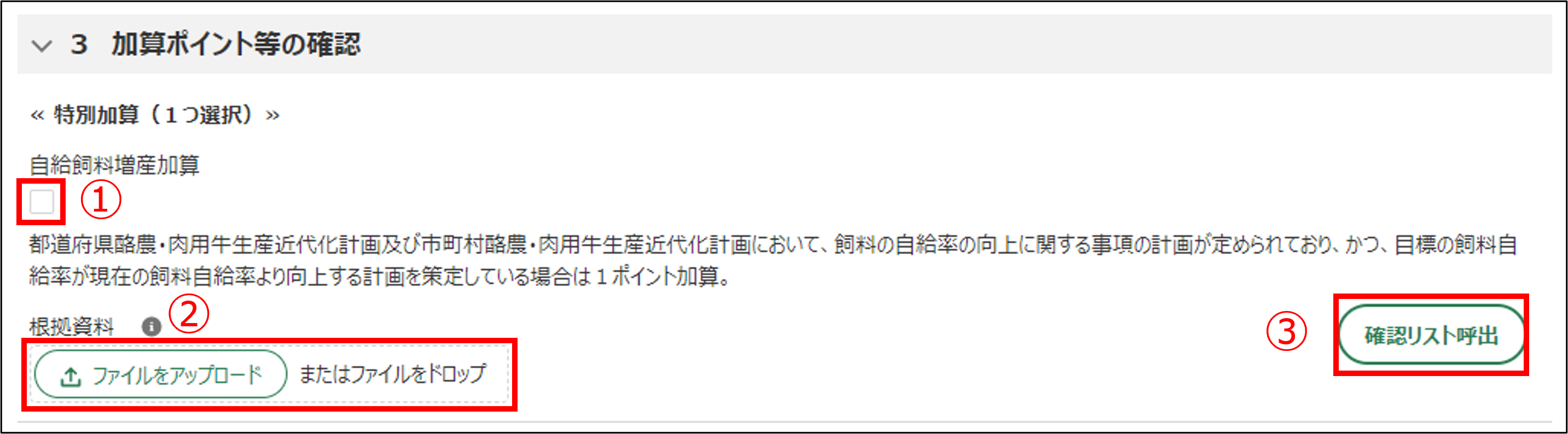 | ③ | 「確認リスト呼出」ボタン | 加算ポイント付与時の参考資料をダウンロード可能です。 |