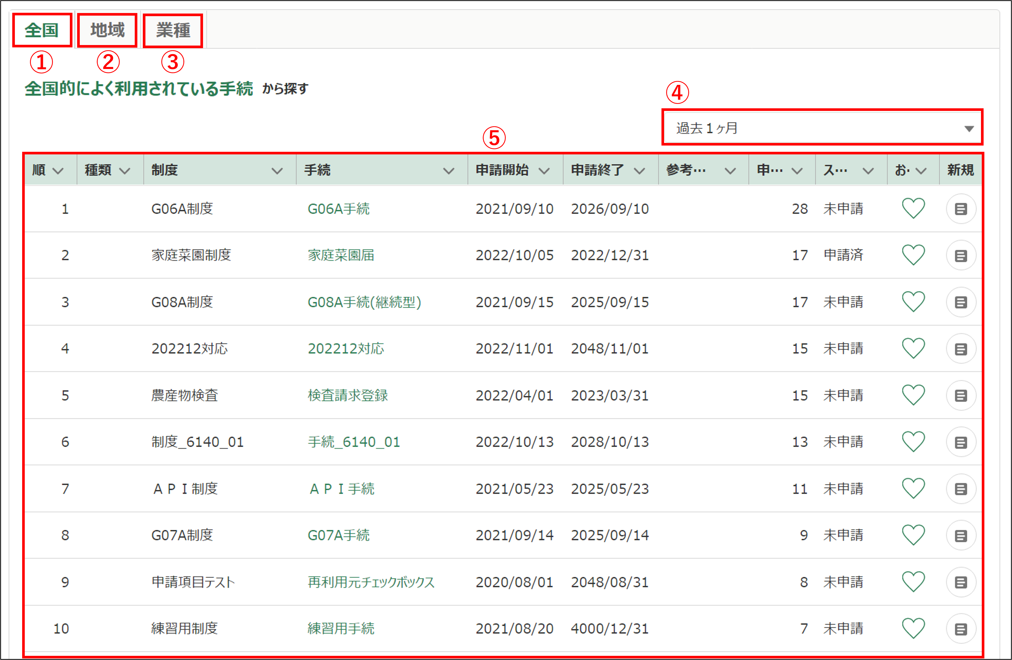 ①~④で指定した条件で、よく利用されている手続が一覧で表示されます。 |