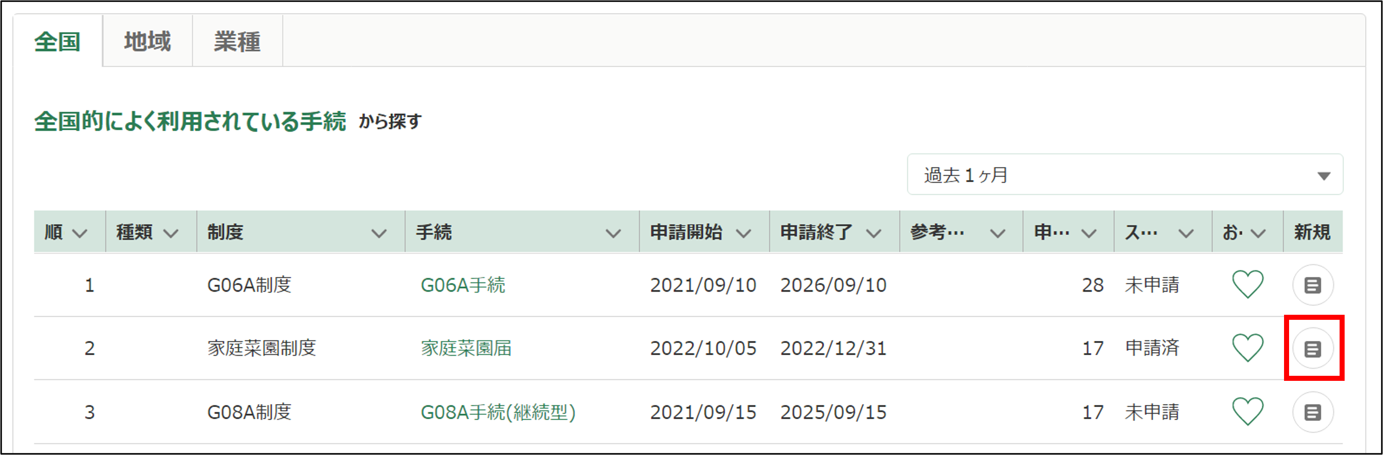 経営体の住所情報(市区町村)を元に、その地域でよく利用されている手続を表示します。 ※申請数が多い上位20件の手続を一覧に表示します。 |