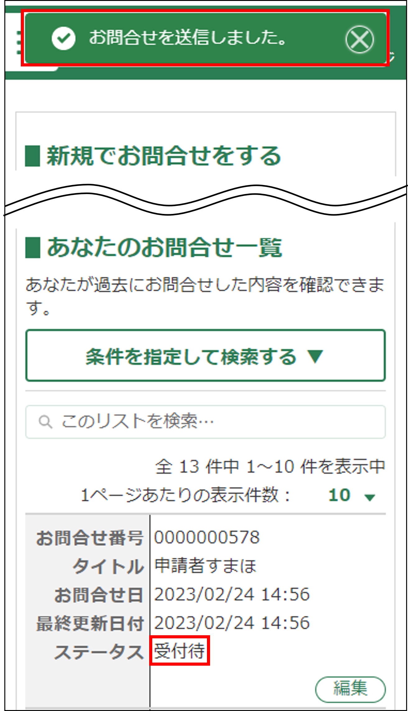 また、ステータスが「受付待」のお問合せが一覧に追加されます。