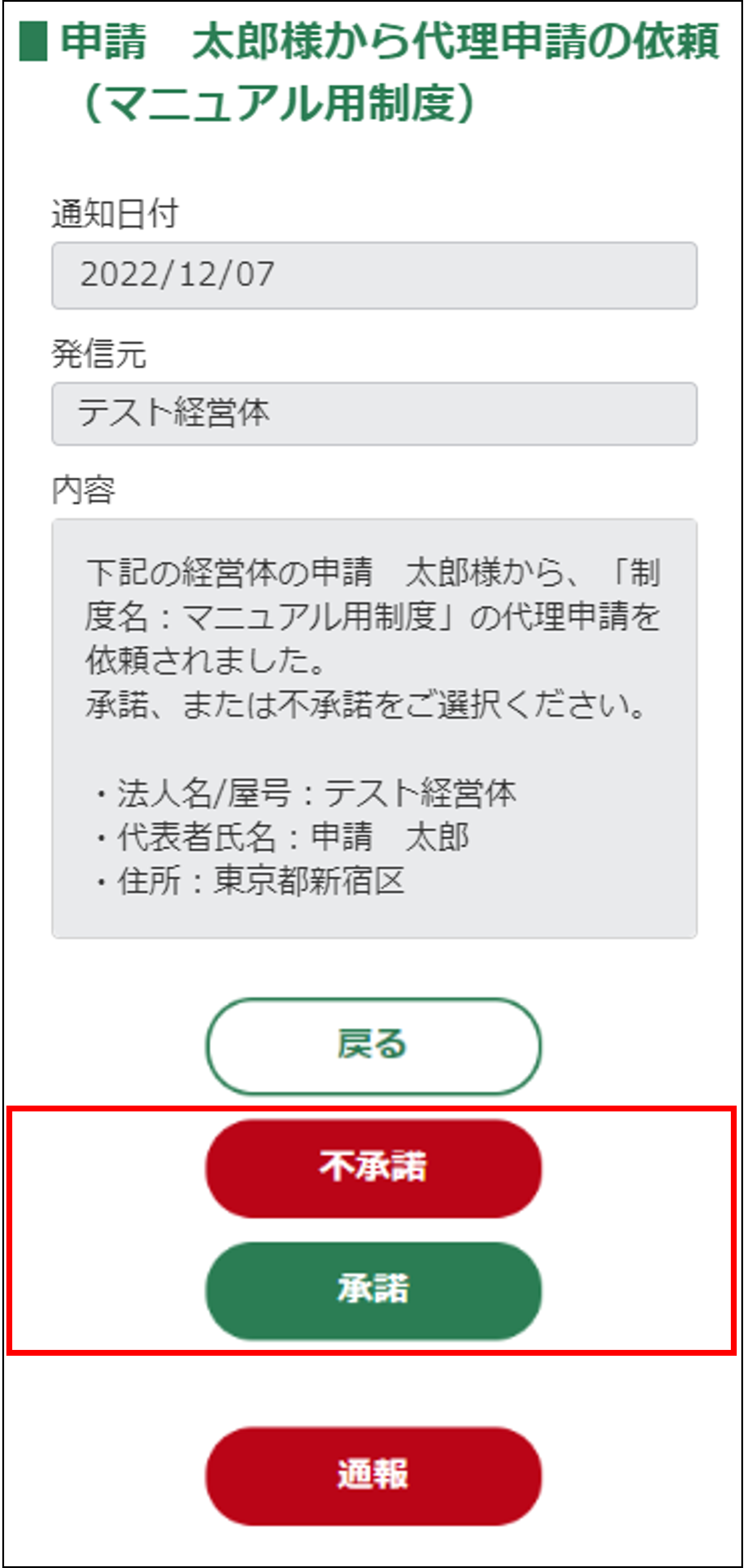 ※誤って「不承諾」ボタンをタップした場合は、依頼元に申請代行の委任を再度行うよう連絡してください。