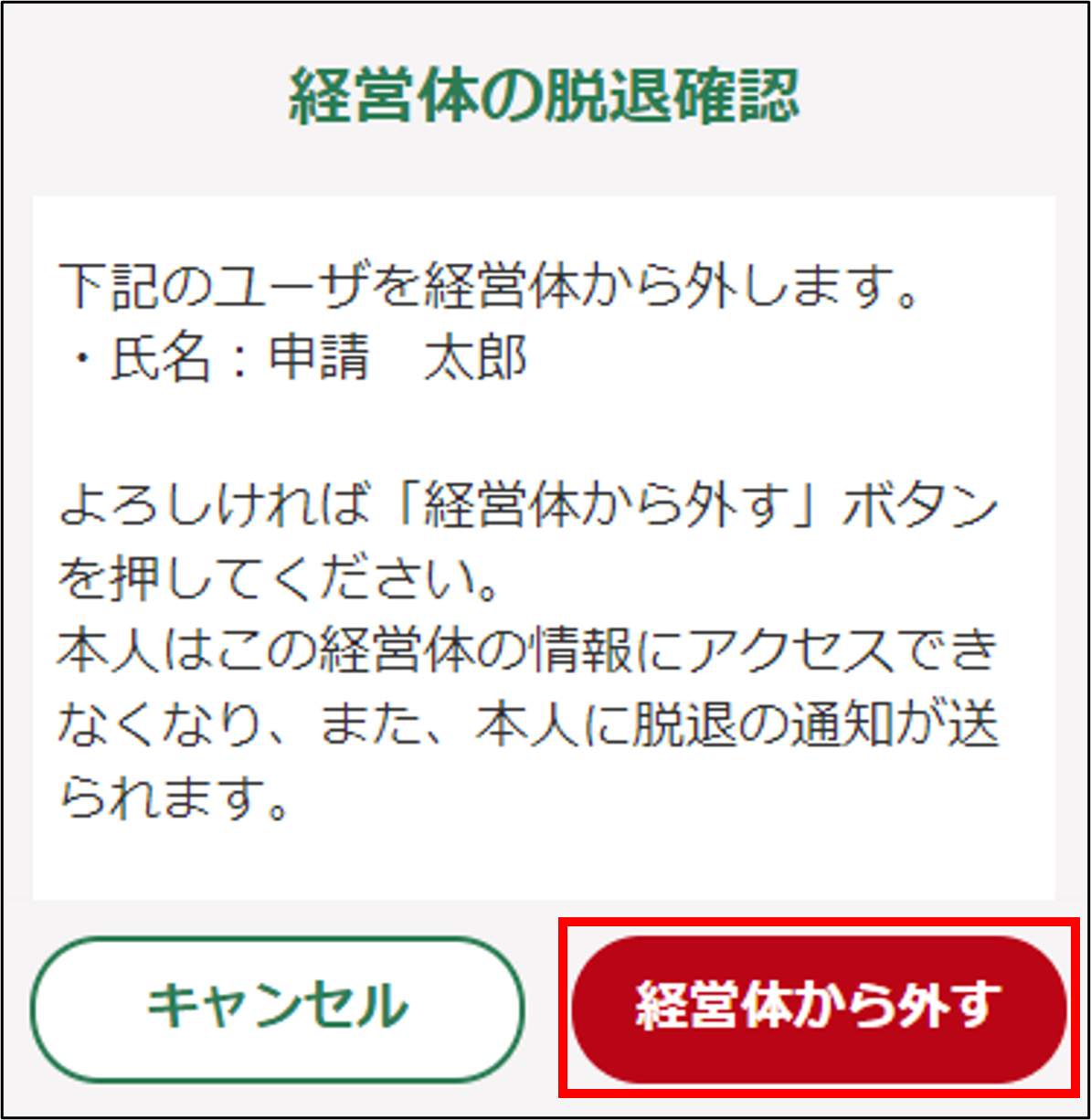 6.「経営体の脱退確認」画面が表示されます。内容を確認のうえ、「経営体から外す」ボタンをタップします。