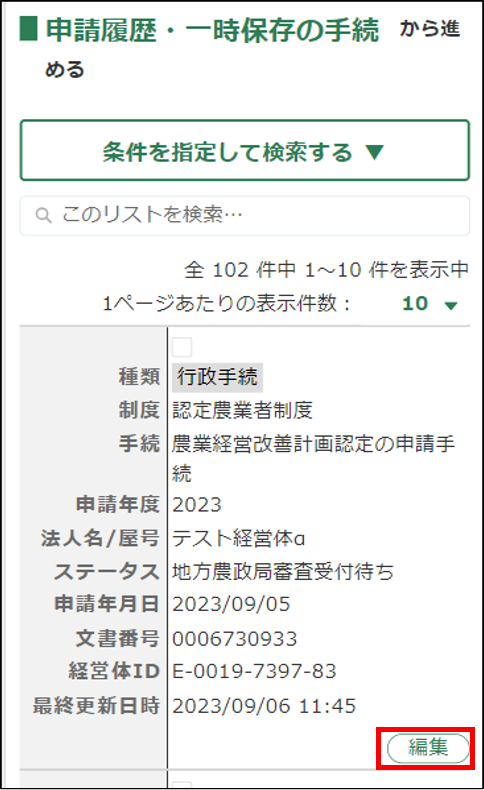 4.検索結果から、帳票出力したい申請の「編集」ボタンをタップします。