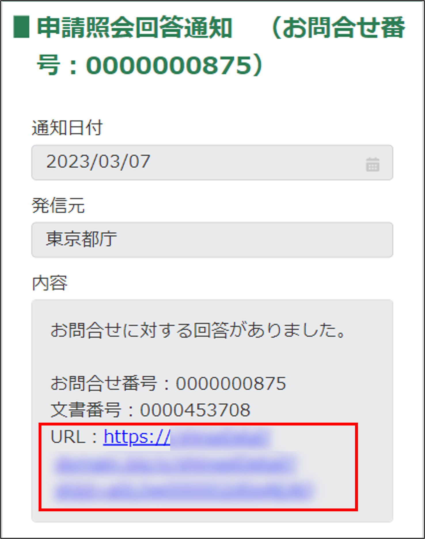 | 申請照会回答通知 | 審査者からお問合せに対する回答を受信した場合に届く通知です。 |