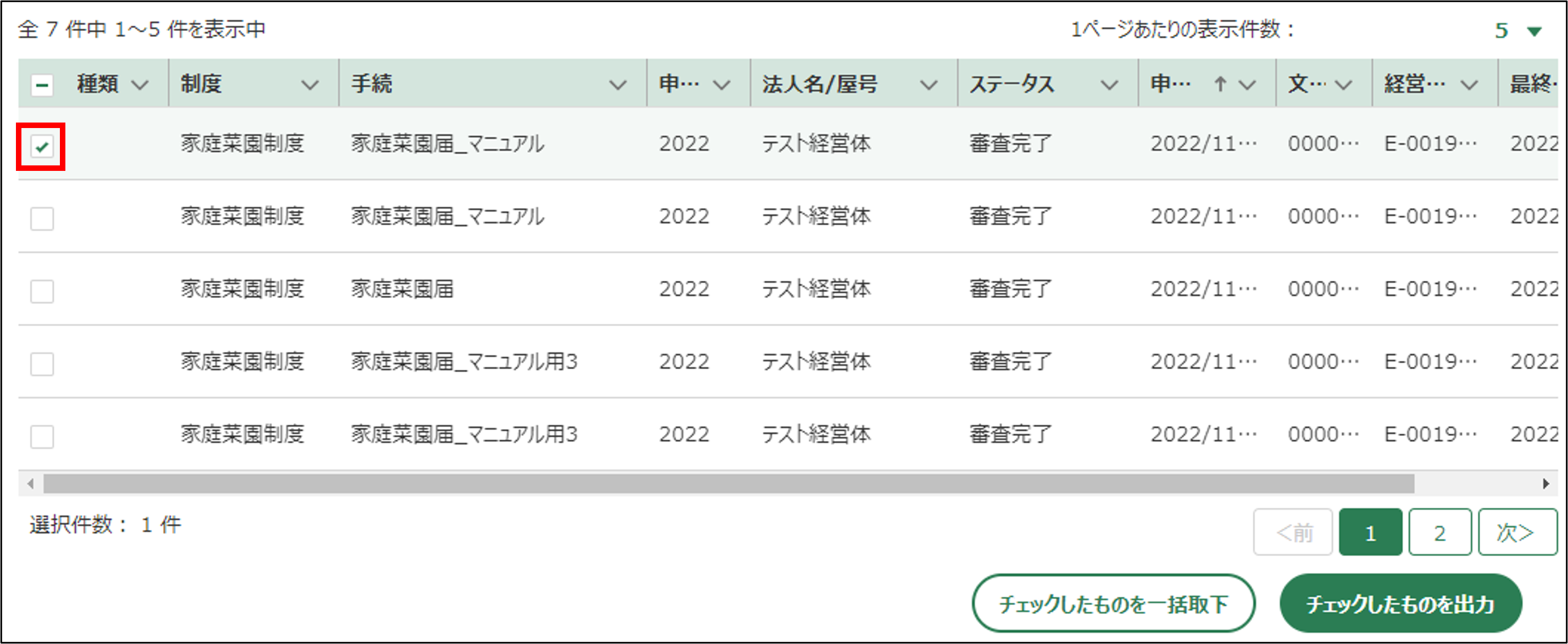 ページをまたいでチェックを入れることはできません。より多くの申請を出力する場合は、1ページ当たりの表示件数を増やしてください。
