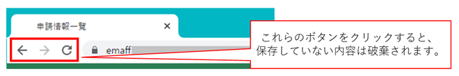 申請内容の入力途中に、ブラウザの「戻る」ボタンや「再読み込み」ボタンをクリックすると、それまで入力した内容が破棄されます。