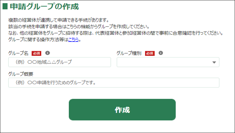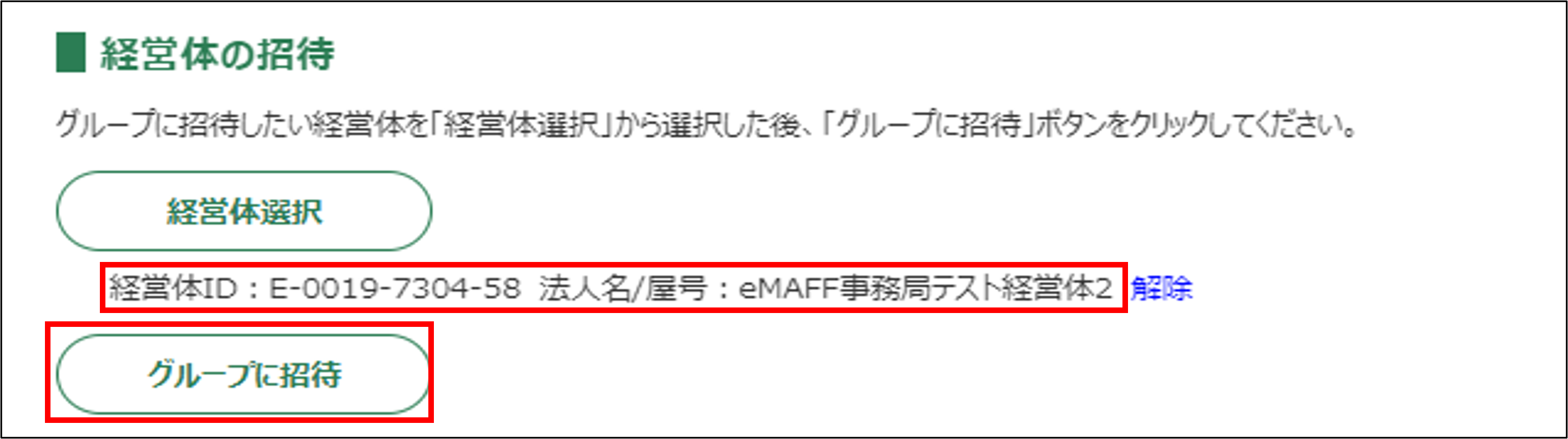 ※招待したい経営体が「グループ申請の機能」を有効にしている場合のみ表示されます。表示されない場合は、「グループ申請の機能」を有効にするよう連絡してください。詳細については、「経営体情報を確認・変更する」の(6)をご参照ください。
