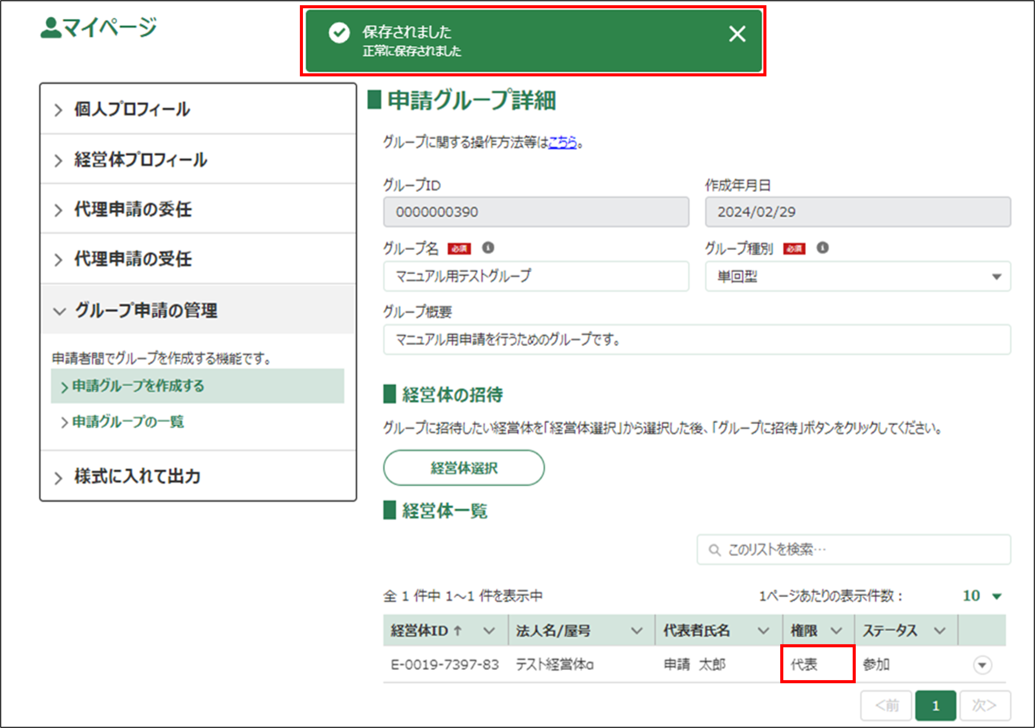 6.「申請グループ詳細」画面の経営体一覧に、自身の経営体が追加されていることを確認します。