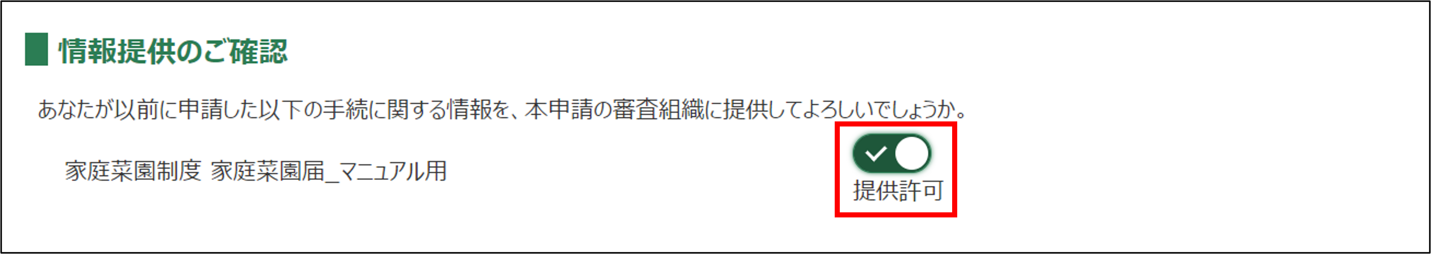 4.以前申請した他手続の情報が審査に必要な場合、「情報提供のご確認」欄が表示されますので、「」をクリックして切り替えます。