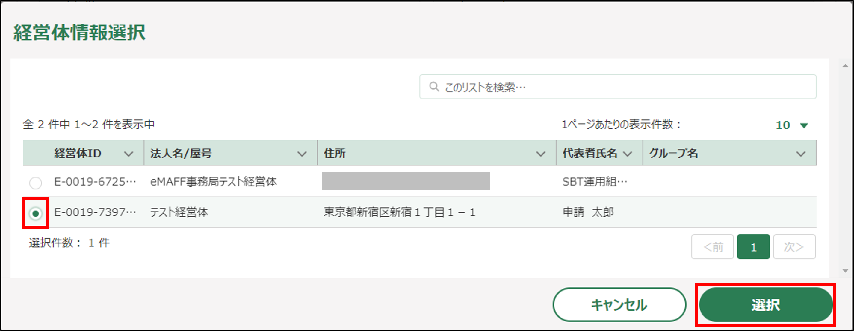 5.「経営体情報選択」画面が表示されます。申請に使用する経営体の左端の「○」をクリックし、「選択」をクリックします。