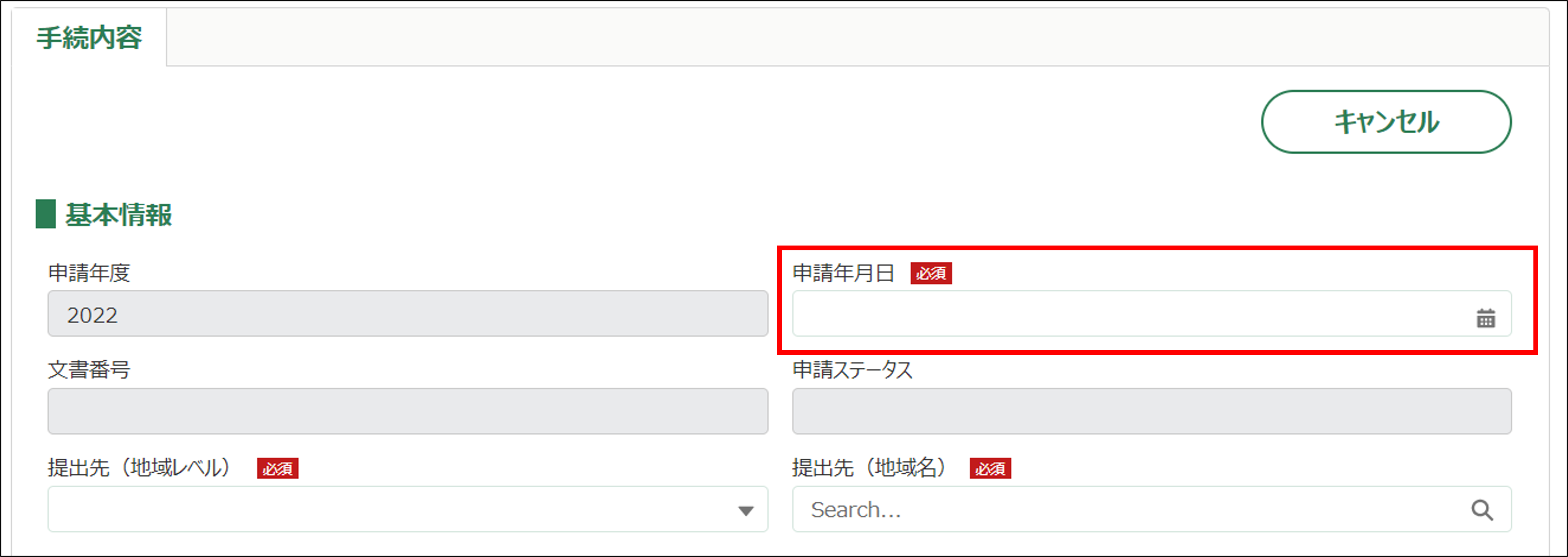 1.「申請年月日」に申請を提出する日付を入力します。「」をクリックすると、カレンダーが表示されます。