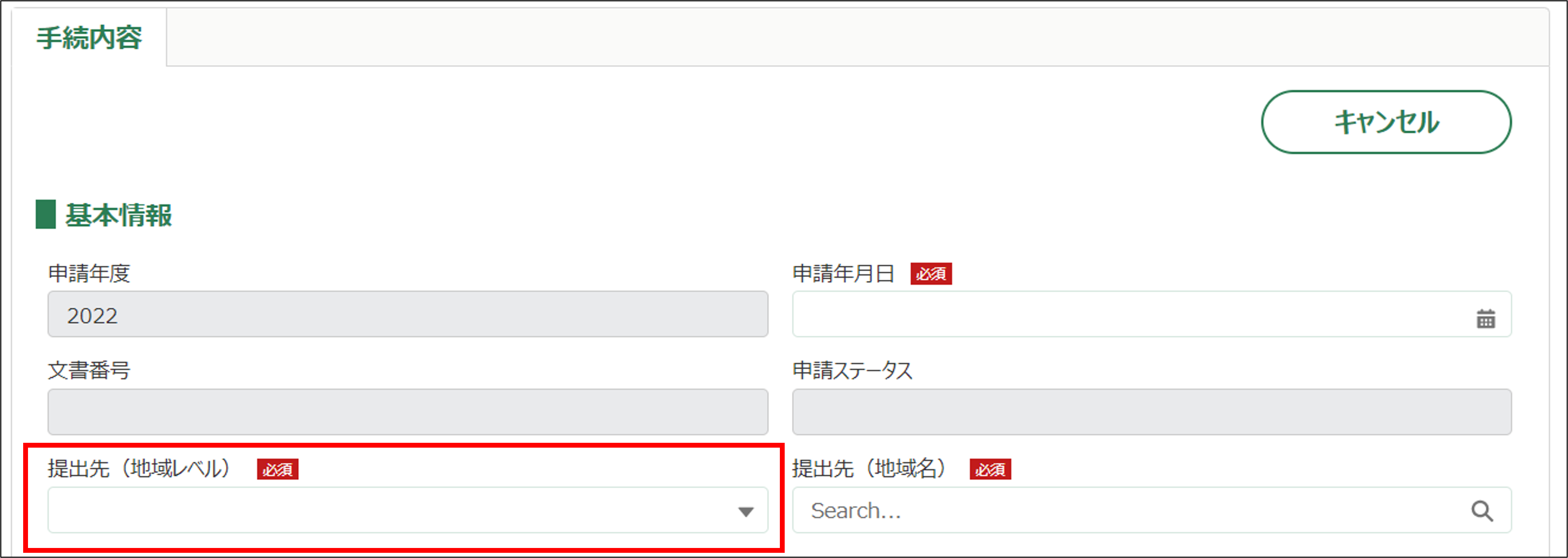 2.「提出先(地域レベル)」欄の「▼」ボタンをクリックし、表示された一覧から、提出先の組織が属する地域レベル(市町村、都道府県等)を選択します。