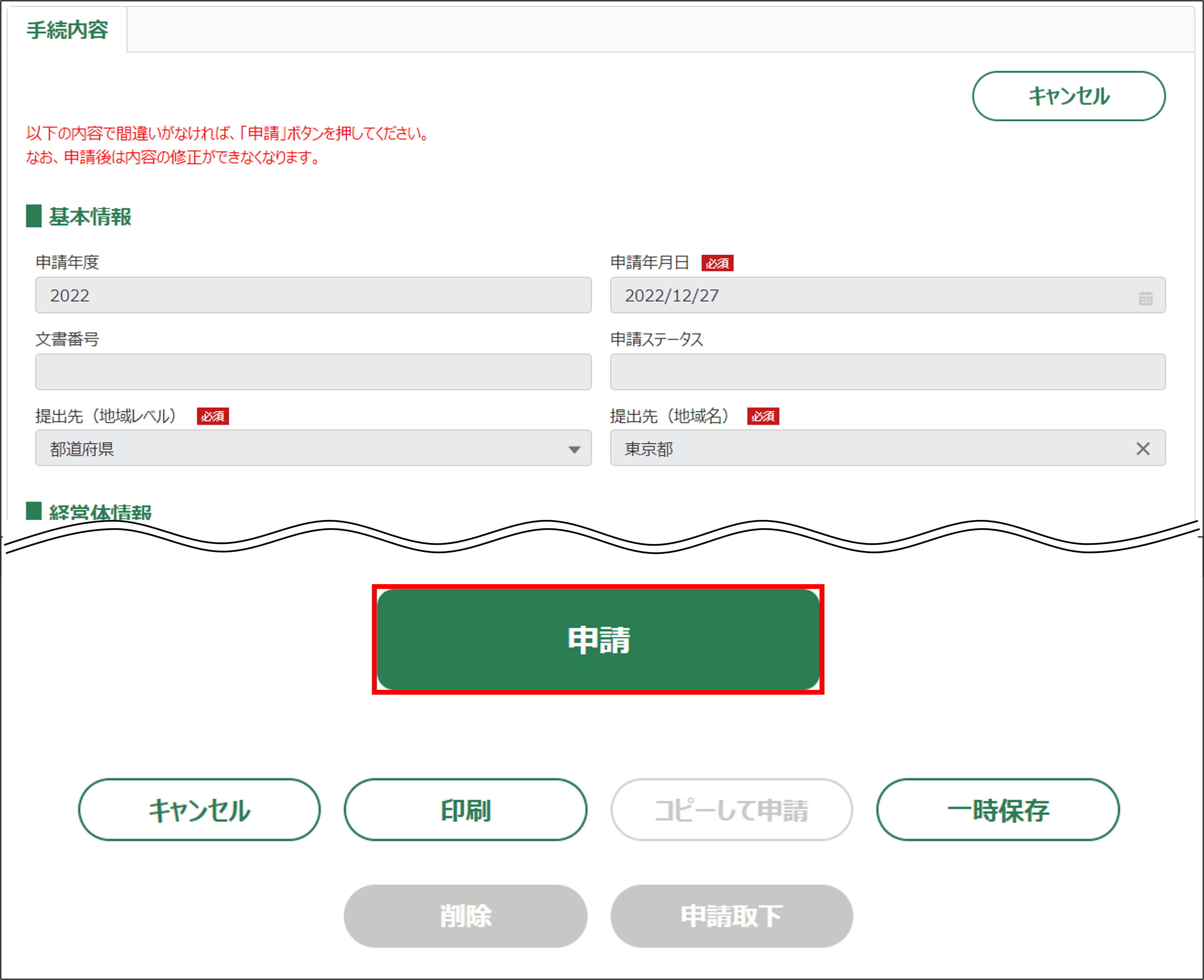内容を確認・修正後、「申請」ボタンをクリックします。