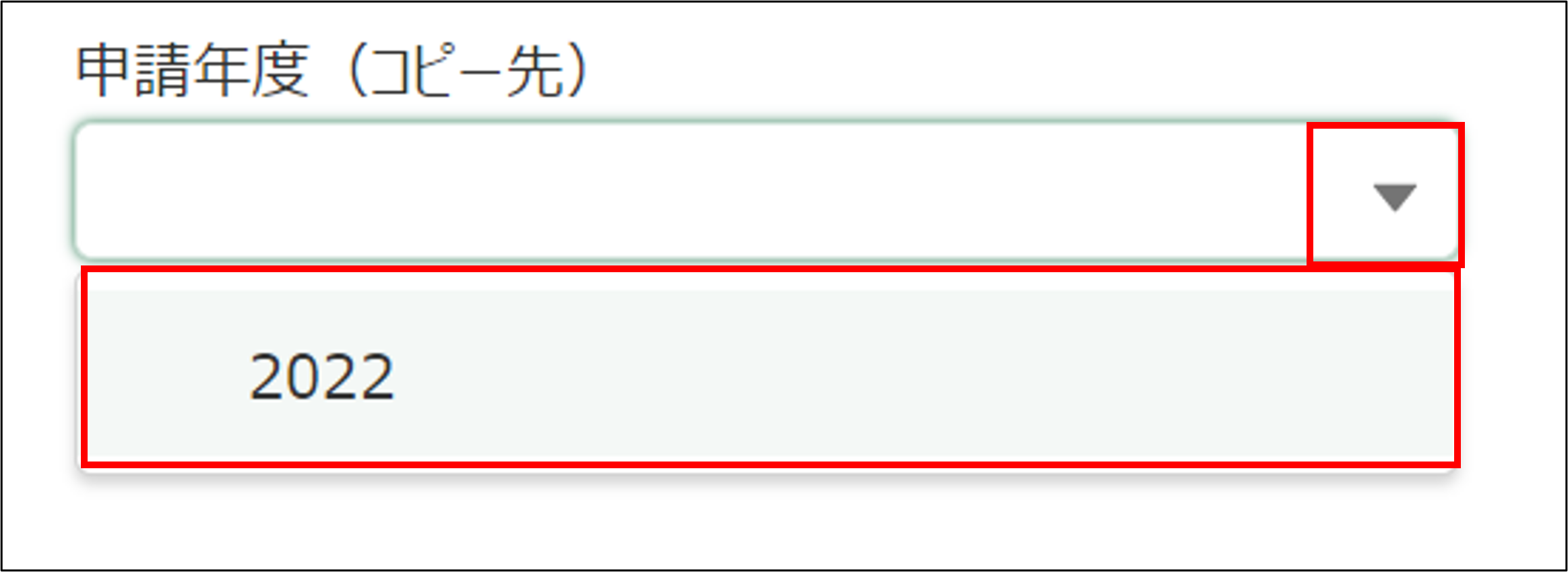 7.「申請年度(コピー先)」右側の「▼」ボタンをクリックし、表示された一覧から申請を行う年度をクリックします。