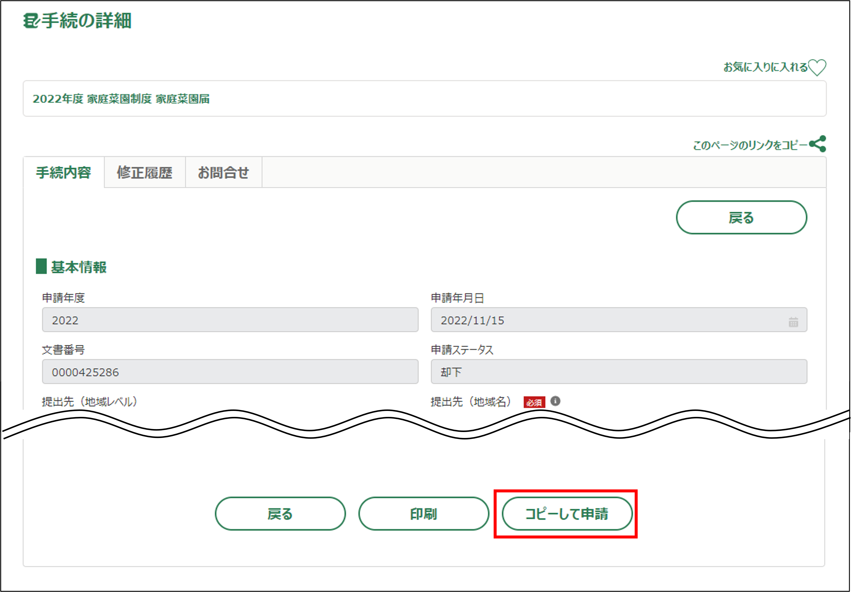 5.「手続の詳細」画面が表示されます。画面下部にある「コピーして申請」をクリックします。