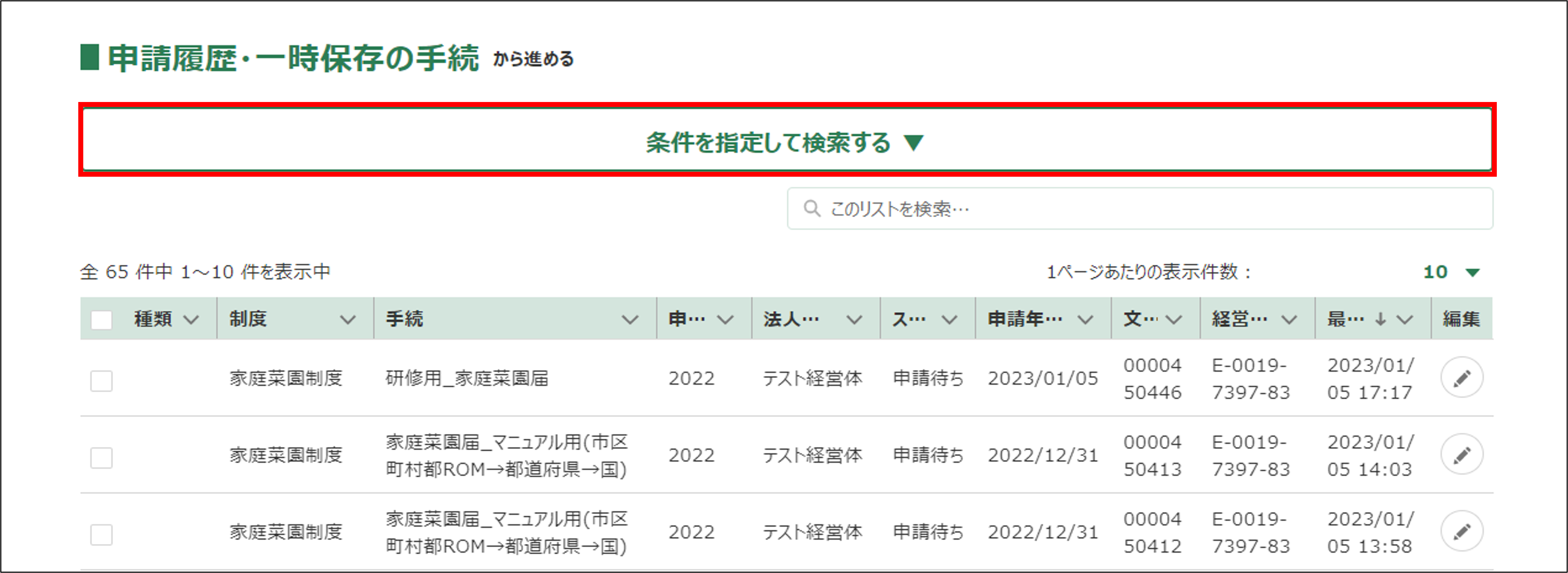 3.利用したい申請の検索条件を入力し、「検索」ボタンをクリックします。